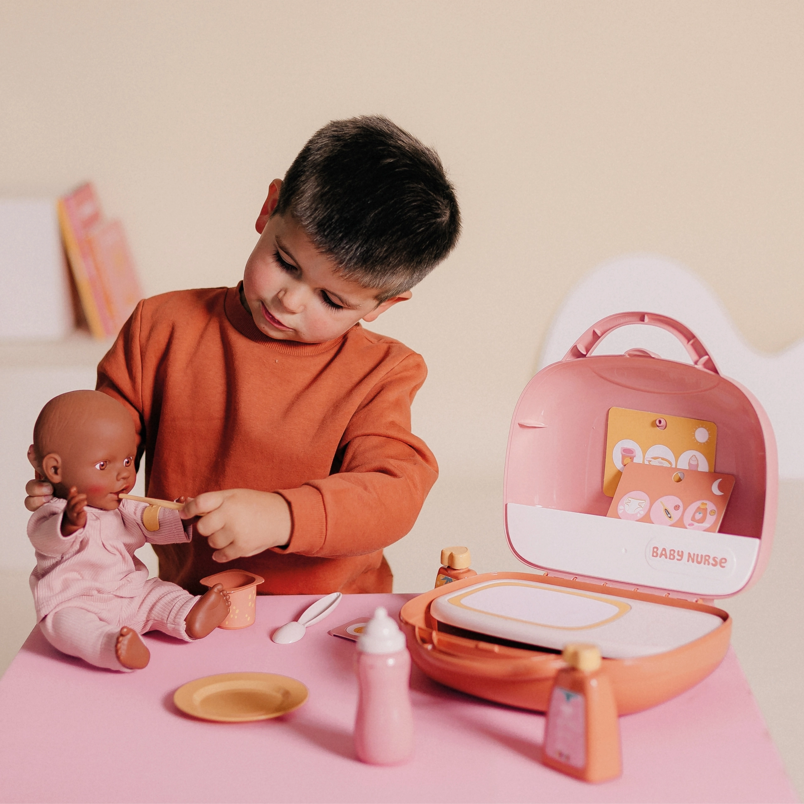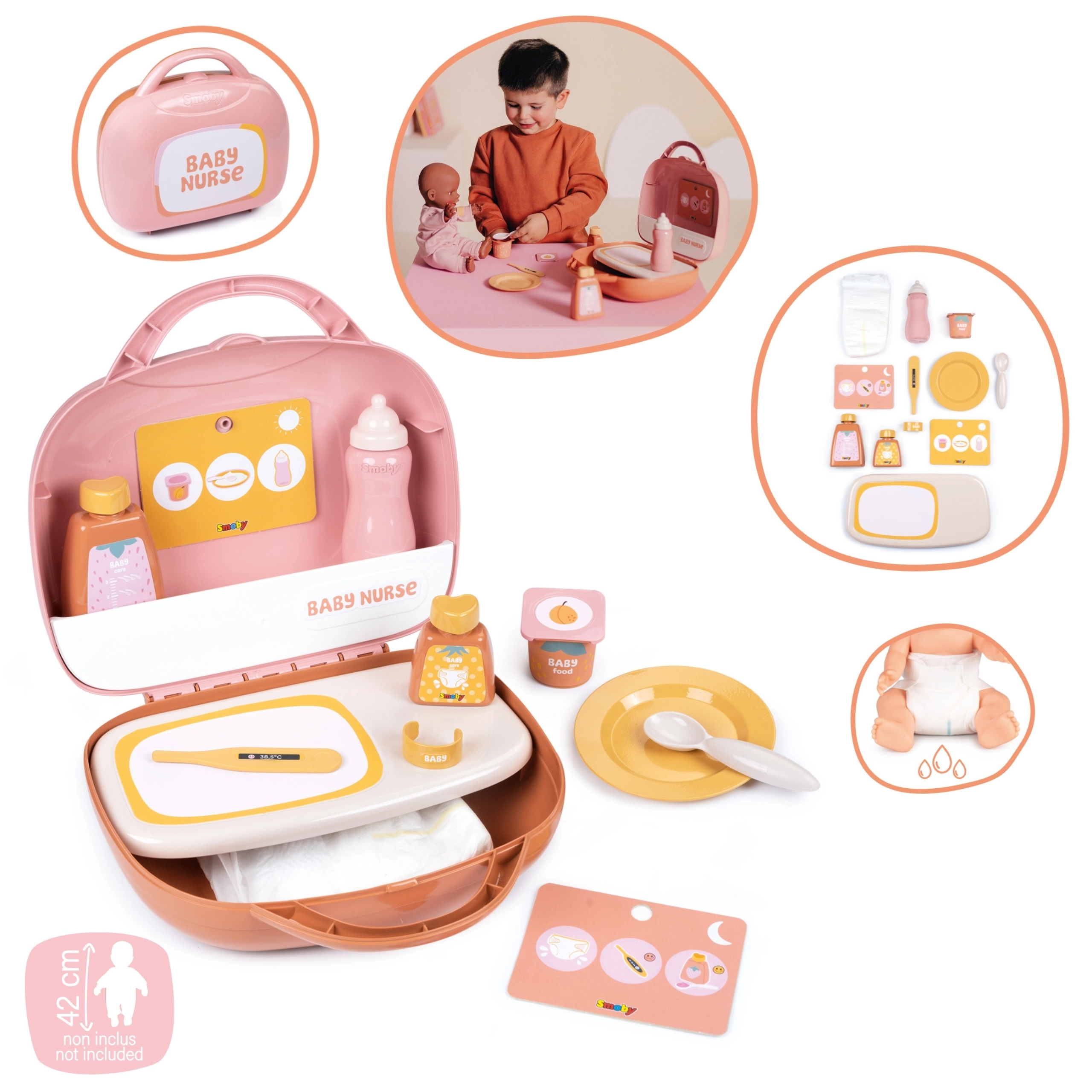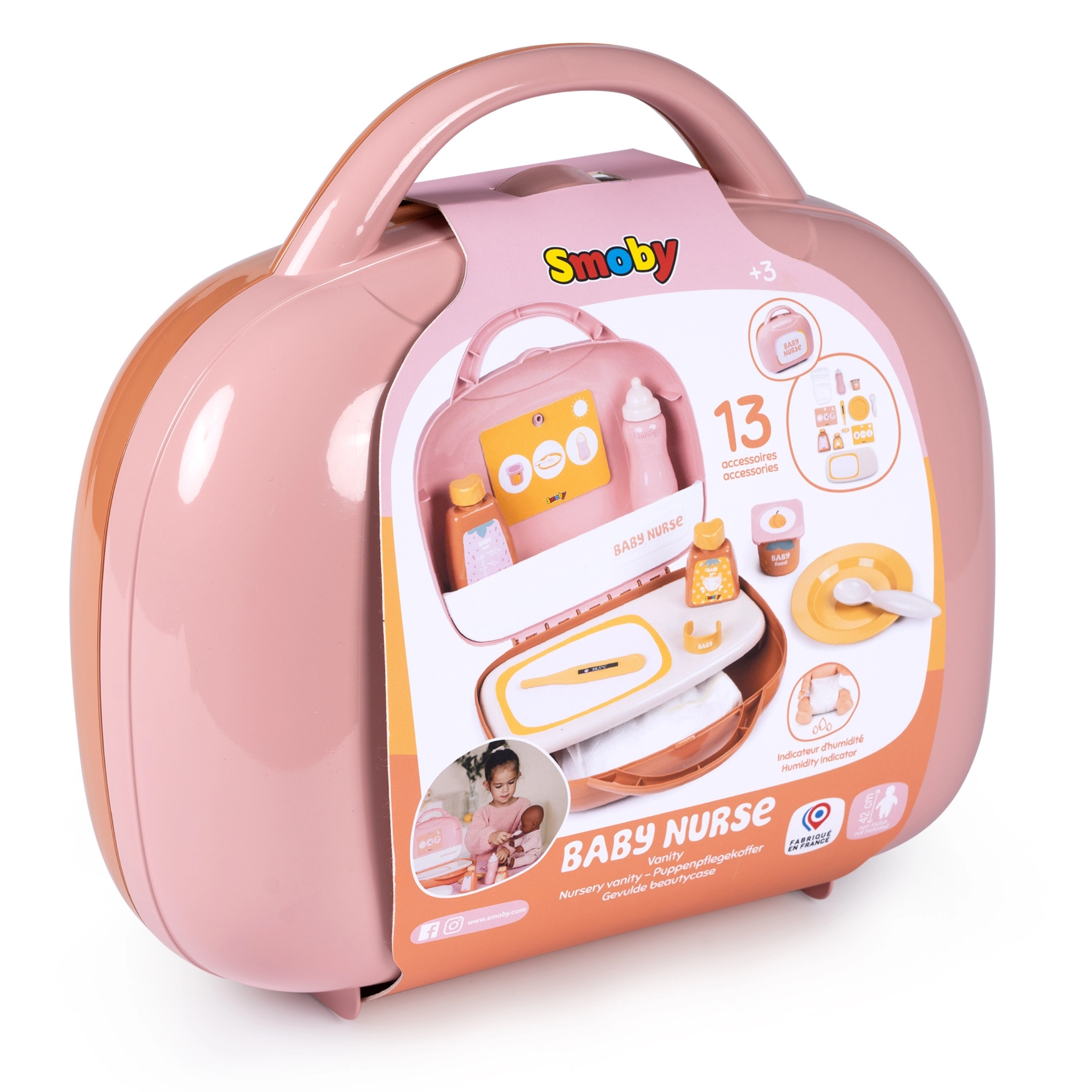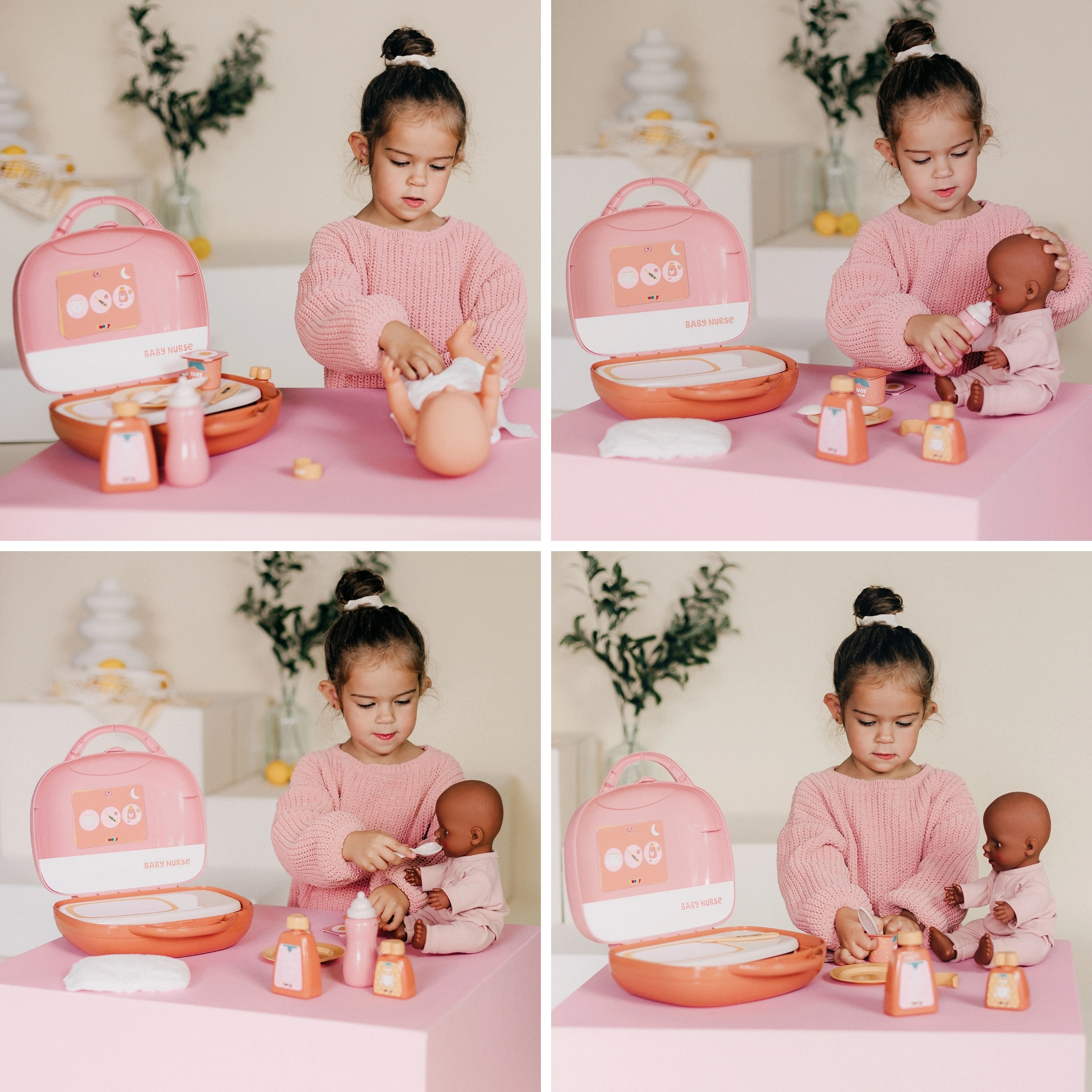Set Baby Nurse u praktičnom koferčiću nudi sve što mali njegovatelji trebaju za imitaciju prave njege bebe. Djeca mogu lutku (nije uključena) nahraniti bočicom, poslužiti „jogurt” na tanjurić, provjeriti temperaturu toplomjerom i koristiti kozmetičke bočice za igru higijene. Zahvaljujući karticama s planom dana i noći naučit će stvarati rutine i rituale njege.