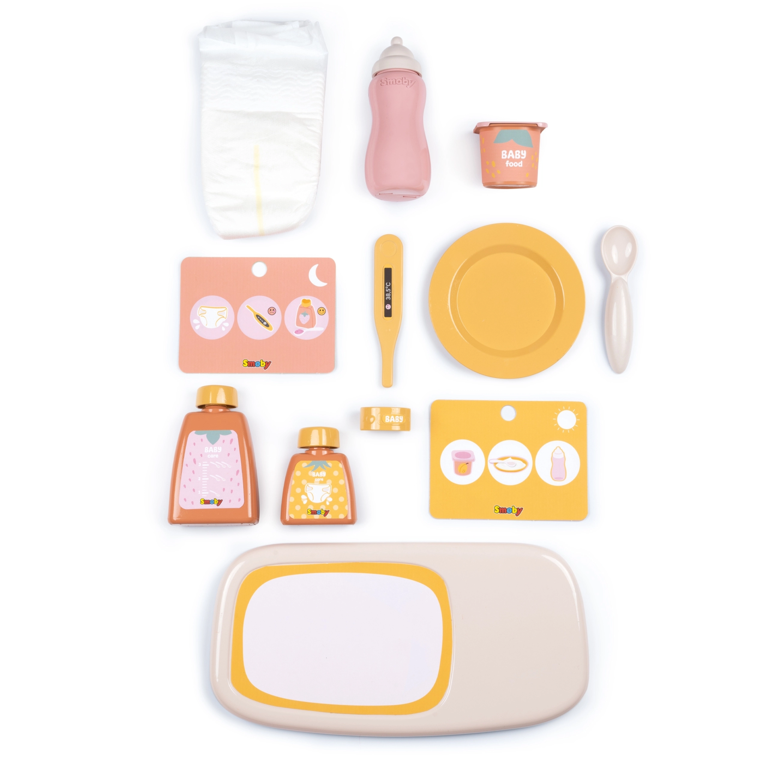 Pelena, bočica, čašica/„jogurt”, tanjurić, žličica, toplomjer, narukvica za ručicu, 2× kozmetička bočica, podloška, kartice s planom dana i noći
