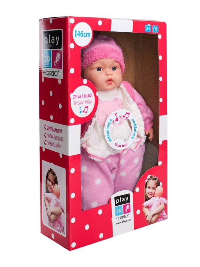 Lutka PlayTo Anička oduševit će realističnom izradom – ima nježno bebino lice, plave oči i ružičaste usnice. Glava, ruke i noge izrađene su od kvalitetne gume, tjelešce je mekano i ugodno na dodir. U trbuščiću ima praktičan džepić s modulom koji nakon pritiska pjeva mađarske pjesmice i govori mađarski. Pakirana je u šarenu kutiju pa je izvrsna i kao poklon.
