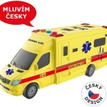 Realistična dječja ambulantna kola na inerciju s svjetlosnim efektima, zvukom sirene i glasovnim porukama dispečera i posade. Plastična izrada, veličina cca 19 cm, idealno za dječake i djevojčice od 3 godine.