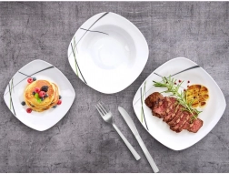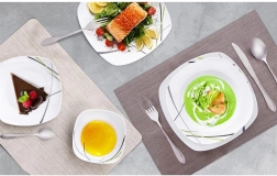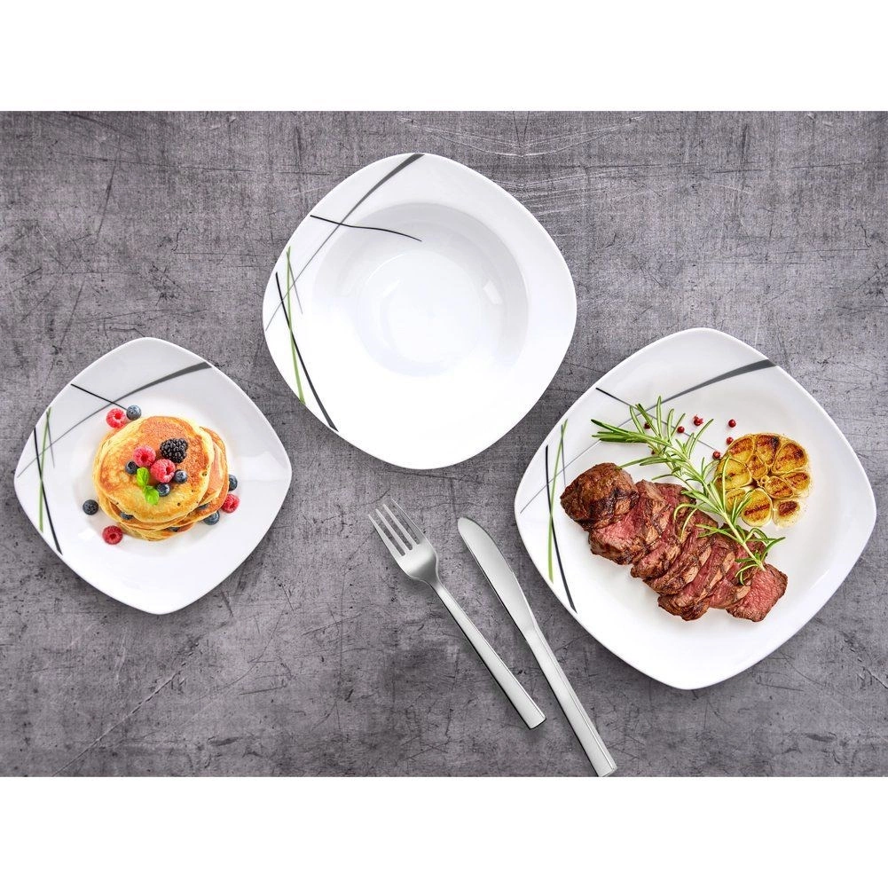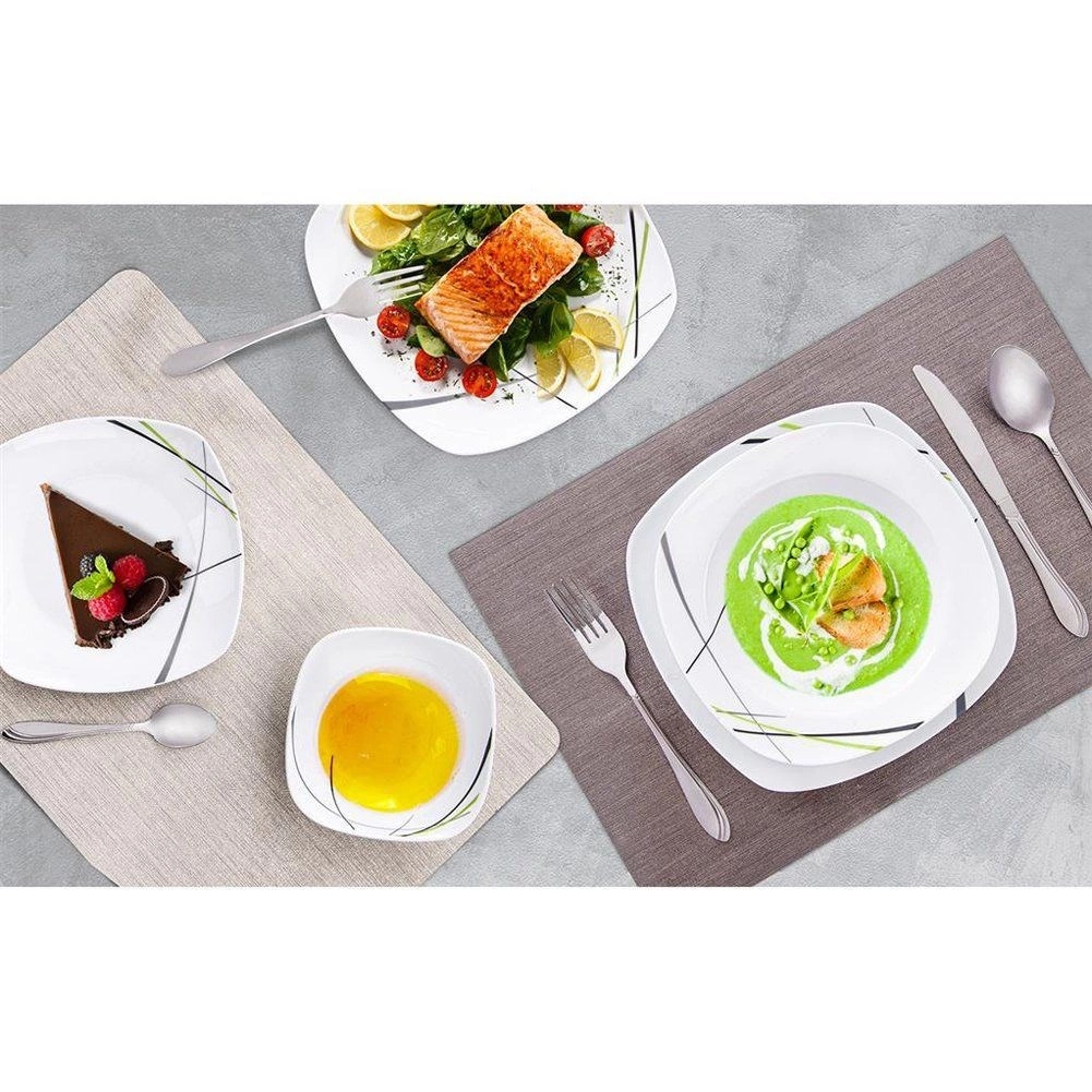 Ovaj kvadratni set za jelo od kvalitetnog porculana donosi stil i praktičnost u svaki dom. Moderan dekor u kombinaciji zelene, crne i sive boje lijepo dolazi do izražaja na stolu te ga je lako uskladiti s ostalom opremom. Idealan je za doručak, ručak i večeru te odlično služi za obiteljska okupljanja i svečane gozbe.