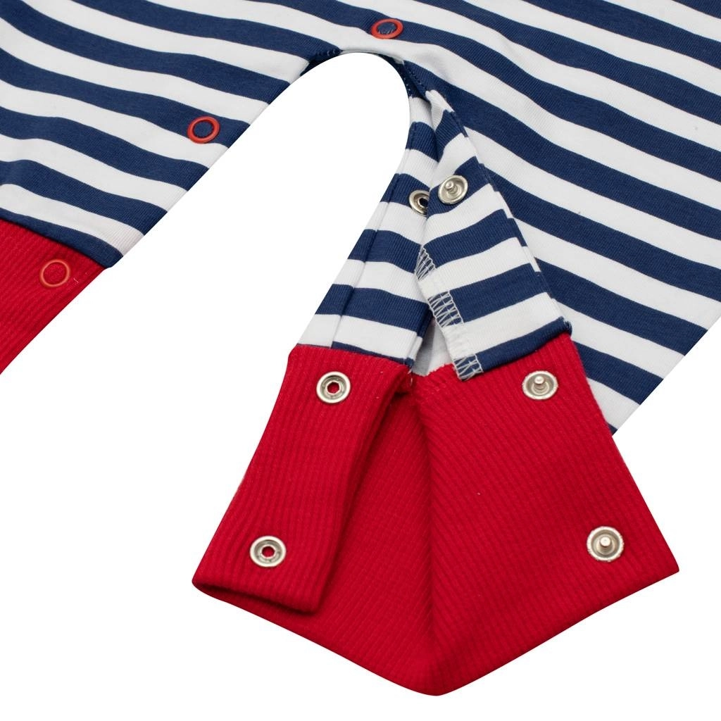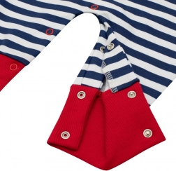 Stilizan ljetni kombinezon za bebe s mornarskim prugama i aplikacijom brodića. Izrađen je od ugodne 100% pamuke, ima praktično kopčanje na ramenima i između nogica za lako odijevanje i presvlačenje te zahvaljujući kroju drži bebina leđa uvijek pokrivenima.