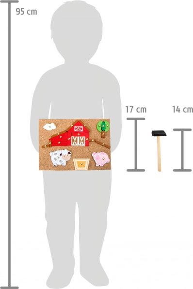 Djeca slažu i zakucavaju oblike na plutnu ploču, čime uvježbavaju koordinaciju, preciznost i maštu pri stvaranju prizora s farme.