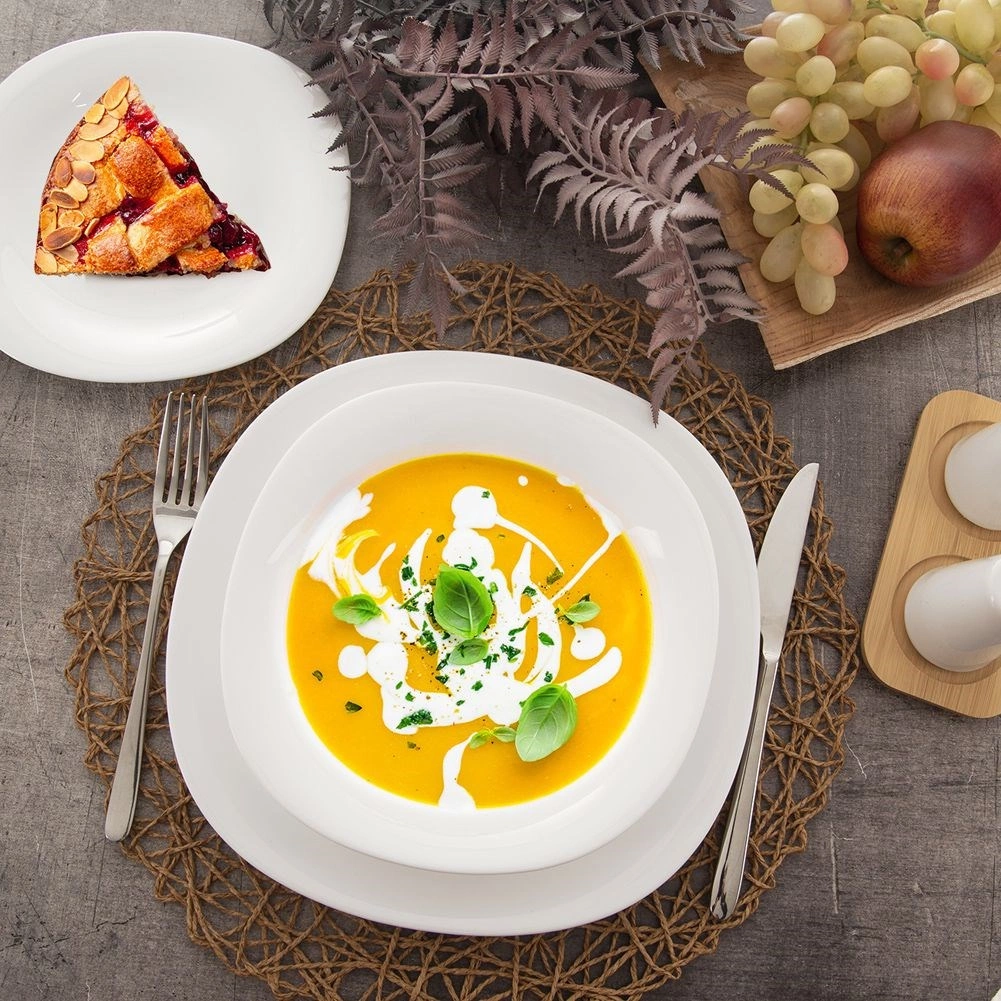 Blagovaonski set LUNA donosi čist, minimalistički dizajn koji je odličan za svakodnevno posluživanje i svečane prigode. Zahvaljujući kvadratnom obliku sa zaobljenim kutovima djeluje moderno i elegantno, a bijela sjajna površina lijepo se uklapa s bilo kojom opremom stola.