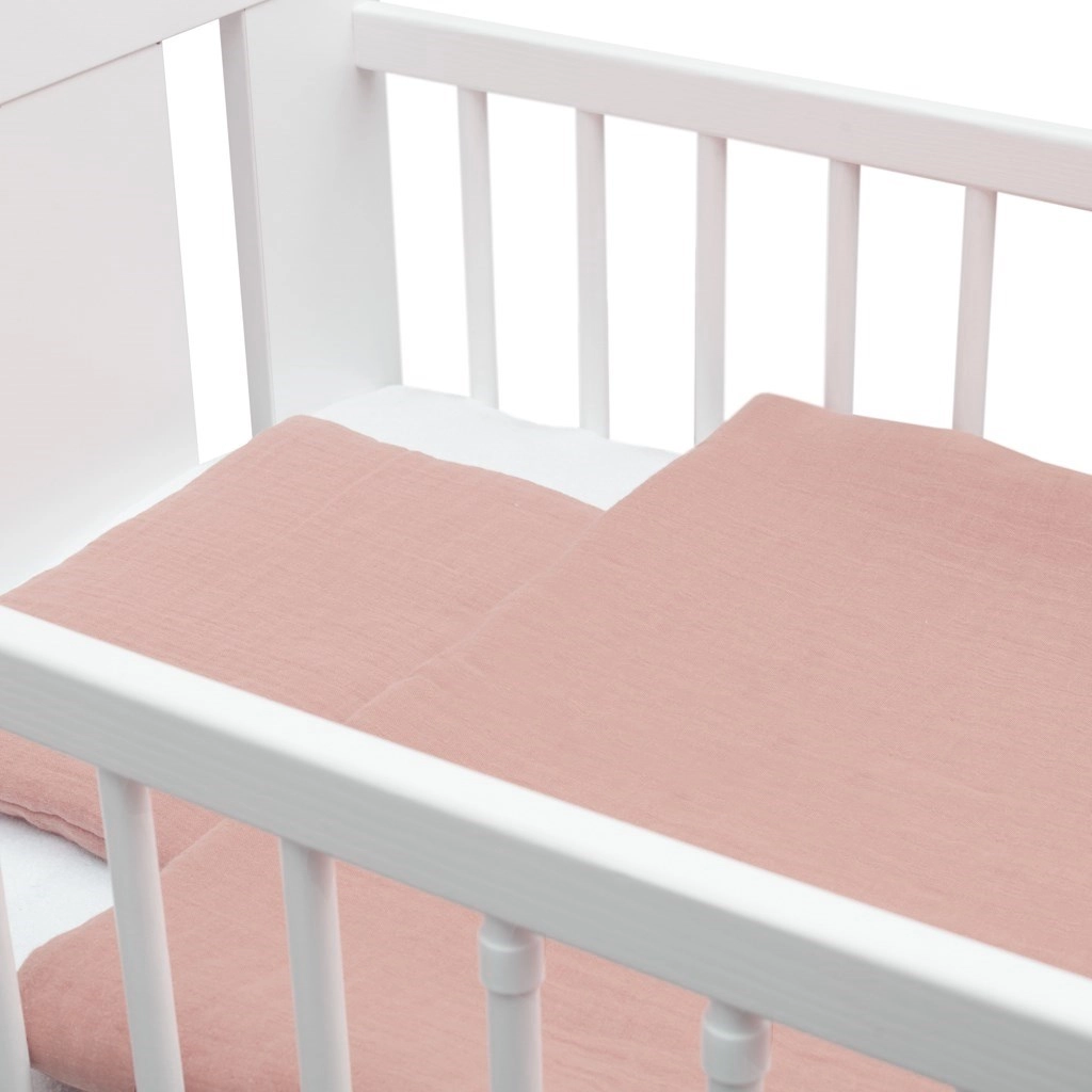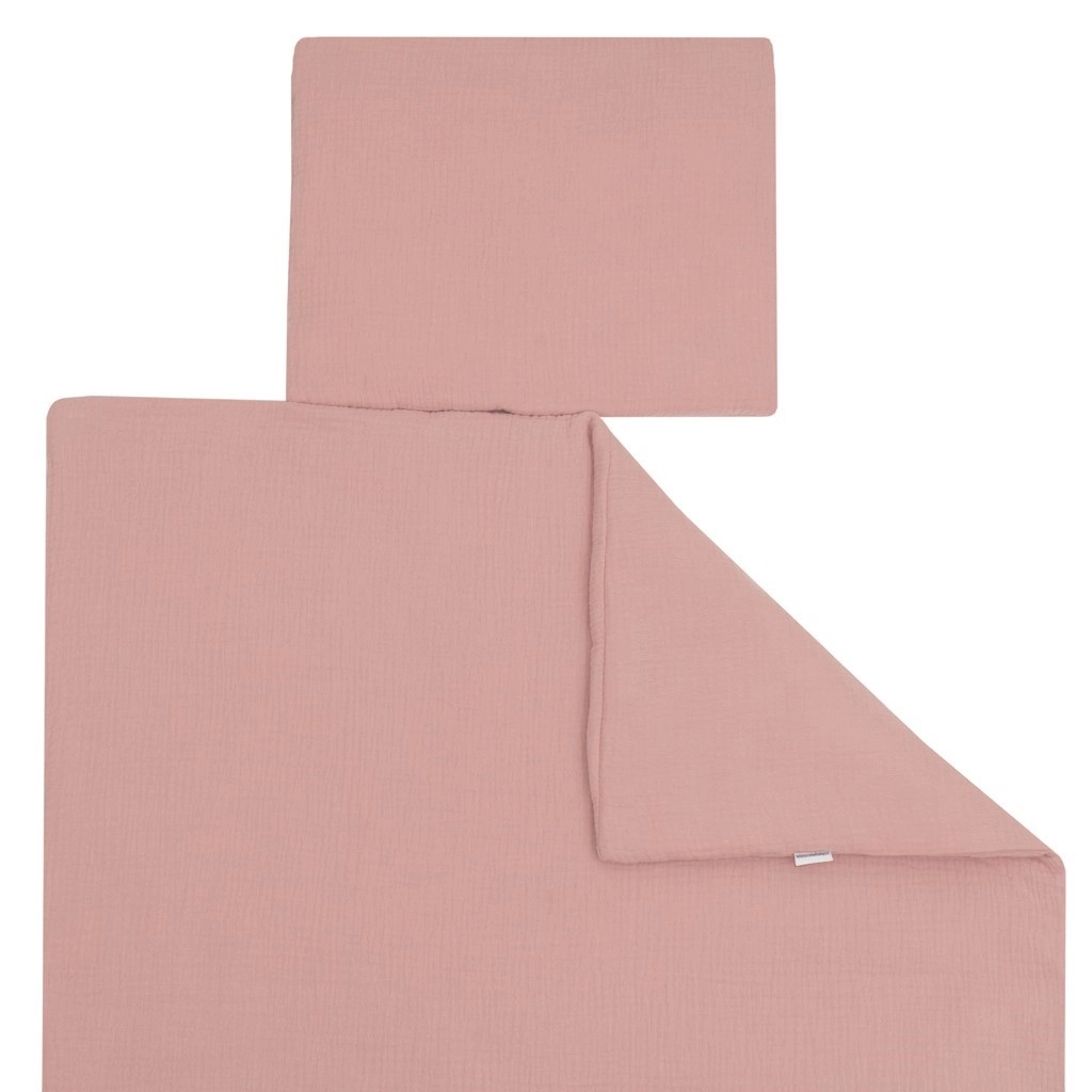 Ova ružičasta mušelinska garnitura donosi bebi udobnost, a roditeljima mir. Mušelin spada među najčišće i najnježnije tkanine – njegova lagana i prozračna struktura omogućuje cirkulaciju zraka i smanjuje rizik od pregrijavanja. Zahvaljujući kvalitetnom punjenju od antialergijskih vlakana, set je siguran i pogodan i za osjetljivu djecu.