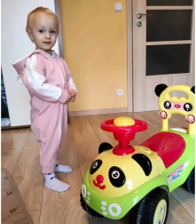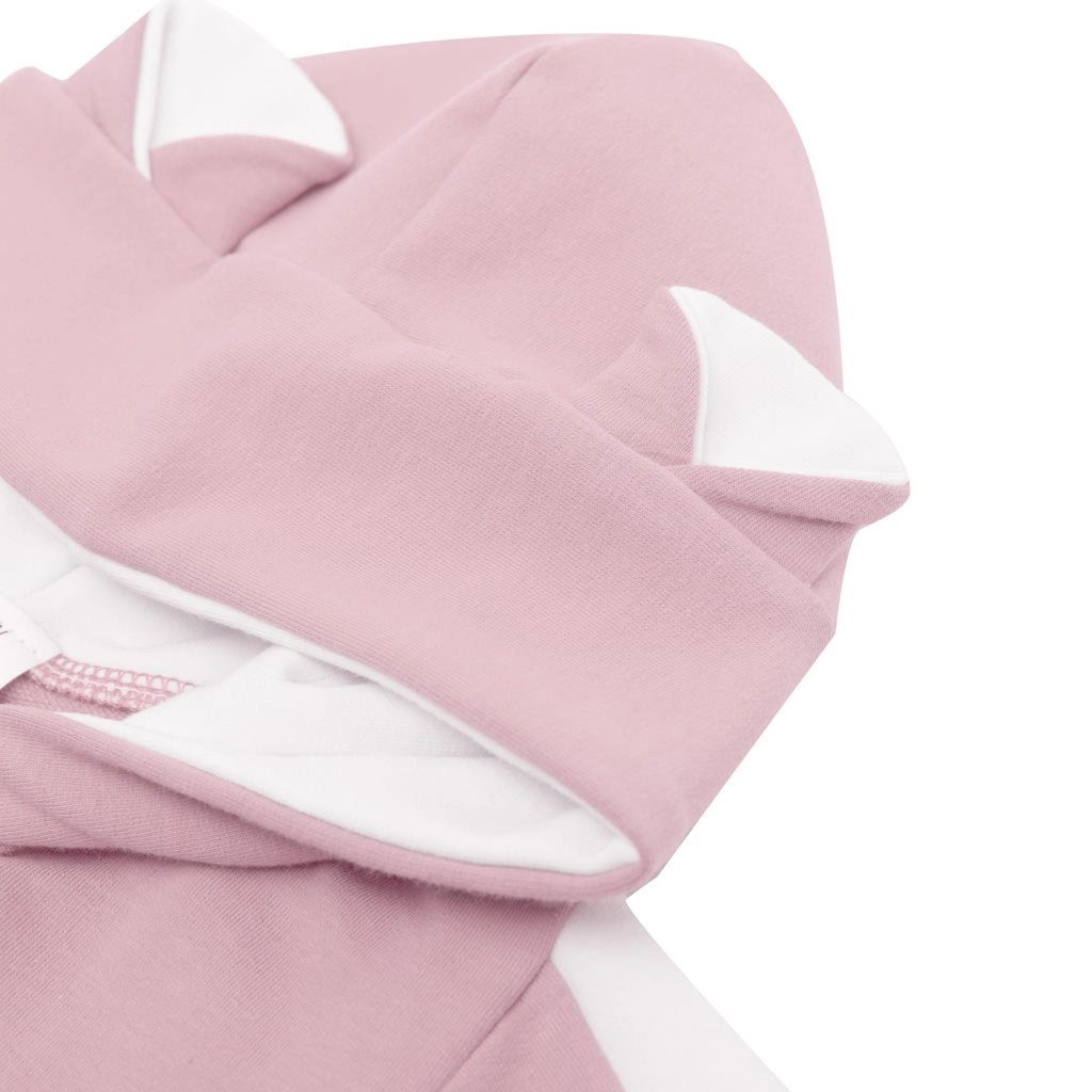 Praktično kopčanje patentnim zatvaračem duž cijele dužine olakšava presvlačenje, dok kapuljača s ušima daje razigran izgled. Podstava kapuljače povećava udobnost i štiti od hladnoće. Elastični rubovi na rukavima i nogavicama pomažu zadržati toplinu i savršeno pristaju.
