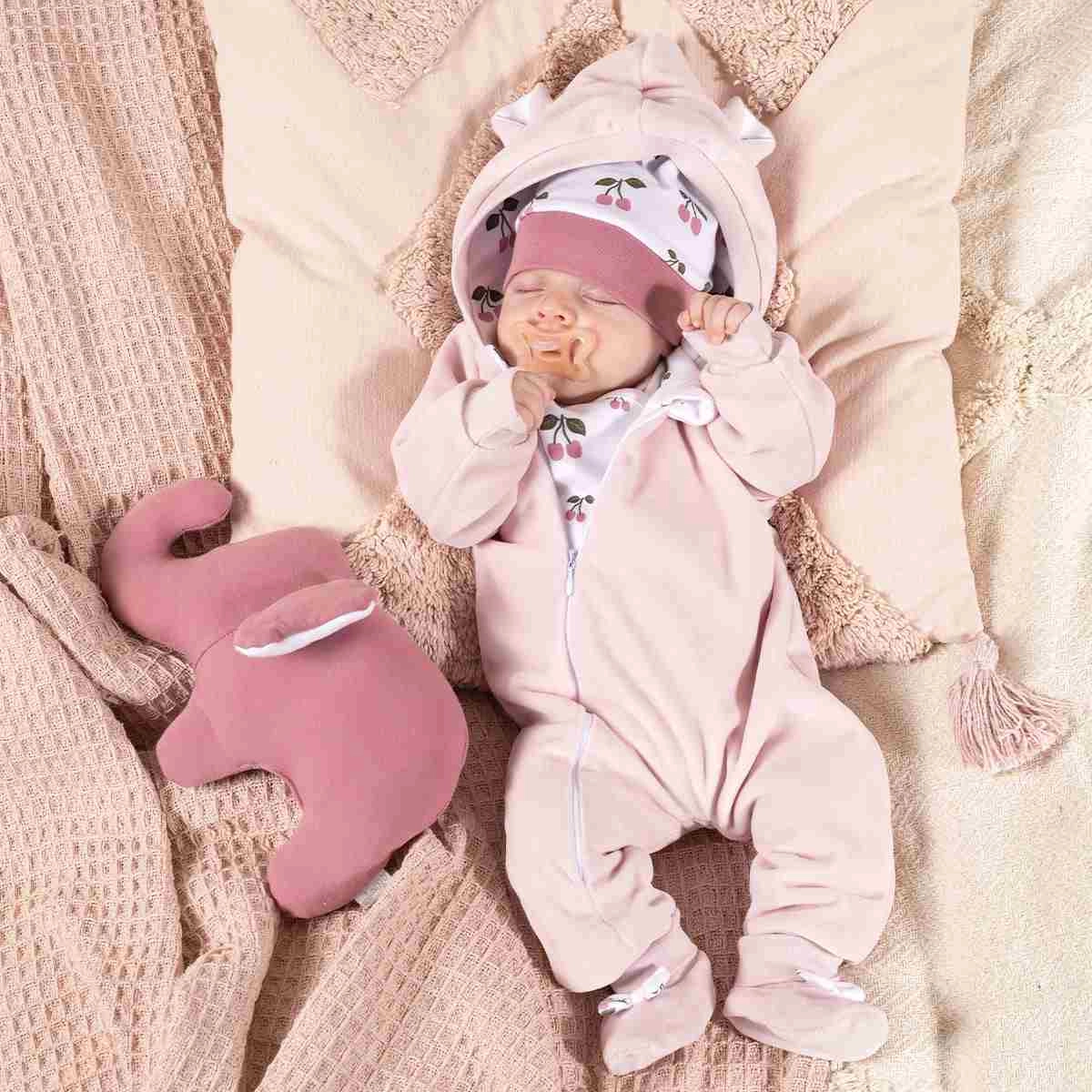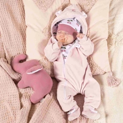 Praktični detalji, poput preklopnih rukava i kapuljače s preslatkim ušima, čine ga idealnim izborom za svakodnevne šetnje i putovanja u kolicima. Materijal dugotrajno zadržava svoj oblik i izgled, pa kombinezon izgleda odlično i nakon ponovljenog pranja.