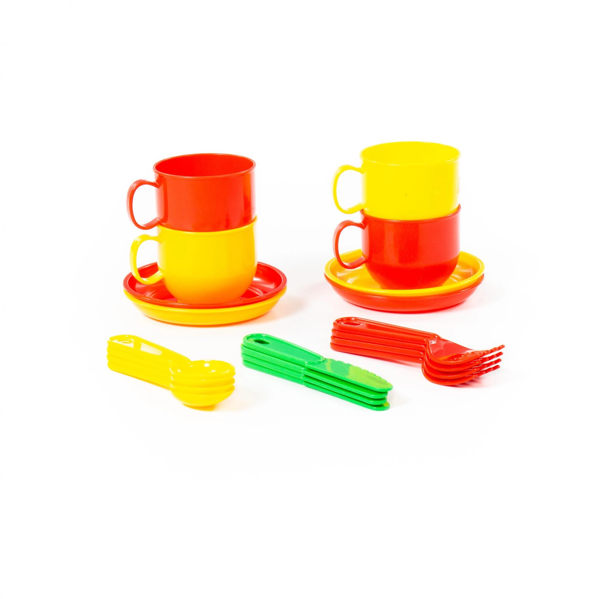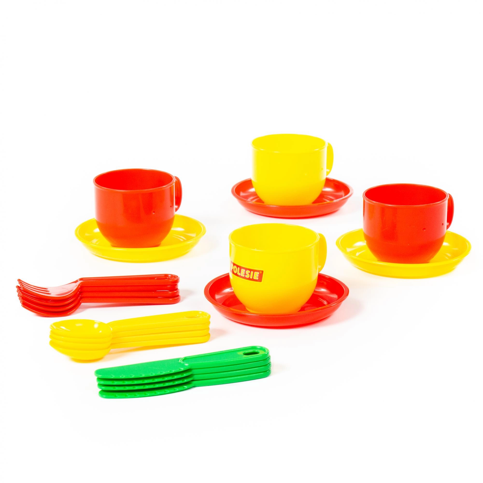 Šareni dječji set posuđa za 4 osobe sadrži poslužavnik, 4 tanjura i 4 šalice s kompletnim priborom za jelo. Idealan za igru čajanke i posluživanje. Zahvaljujući laganim i otpornim plastikama, set je siguran i jednostavan za održavanje. Lagan, izdržljiv i lako periv dječji set potiče igru uloga, finu motoriku i društvenu igru.