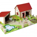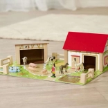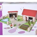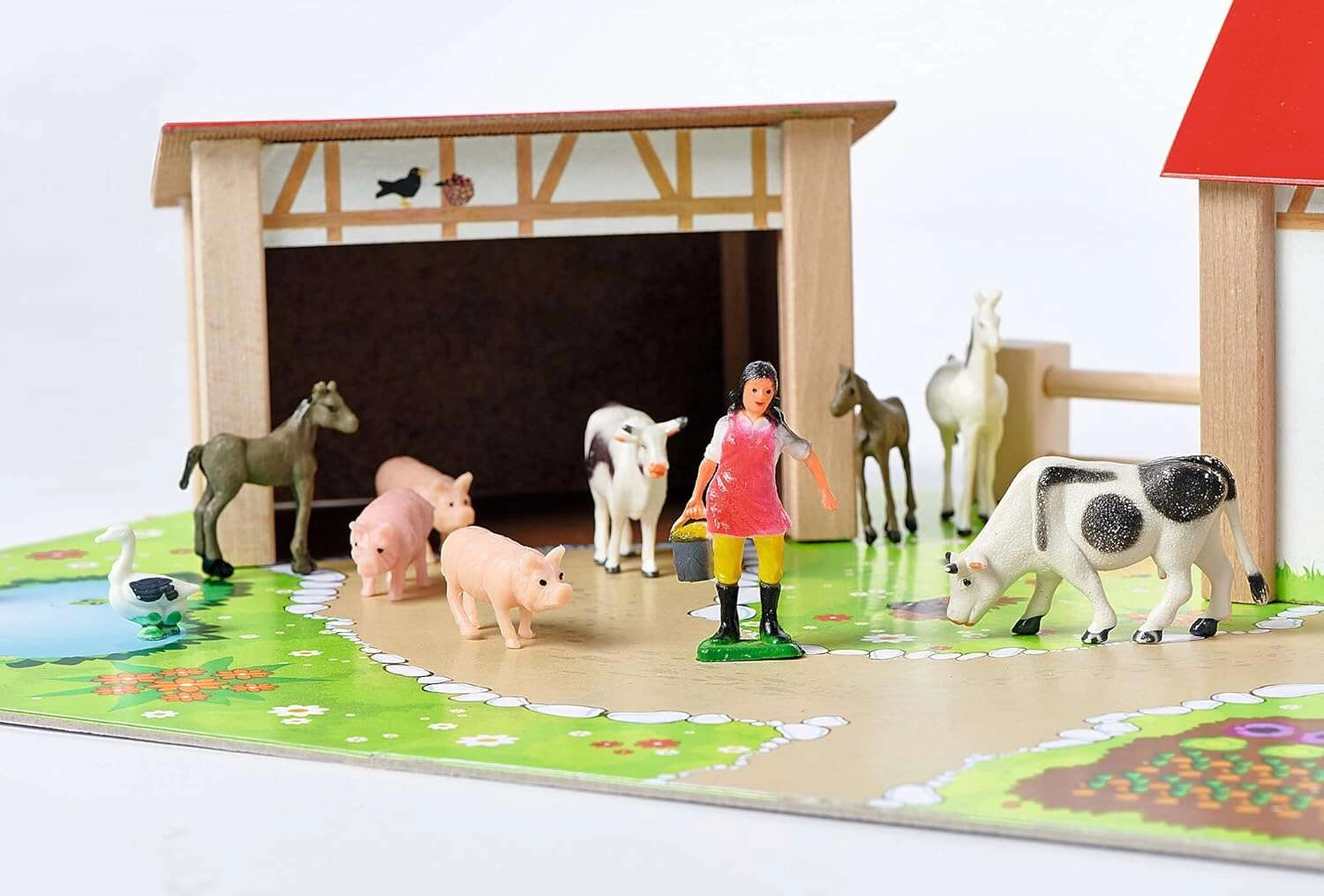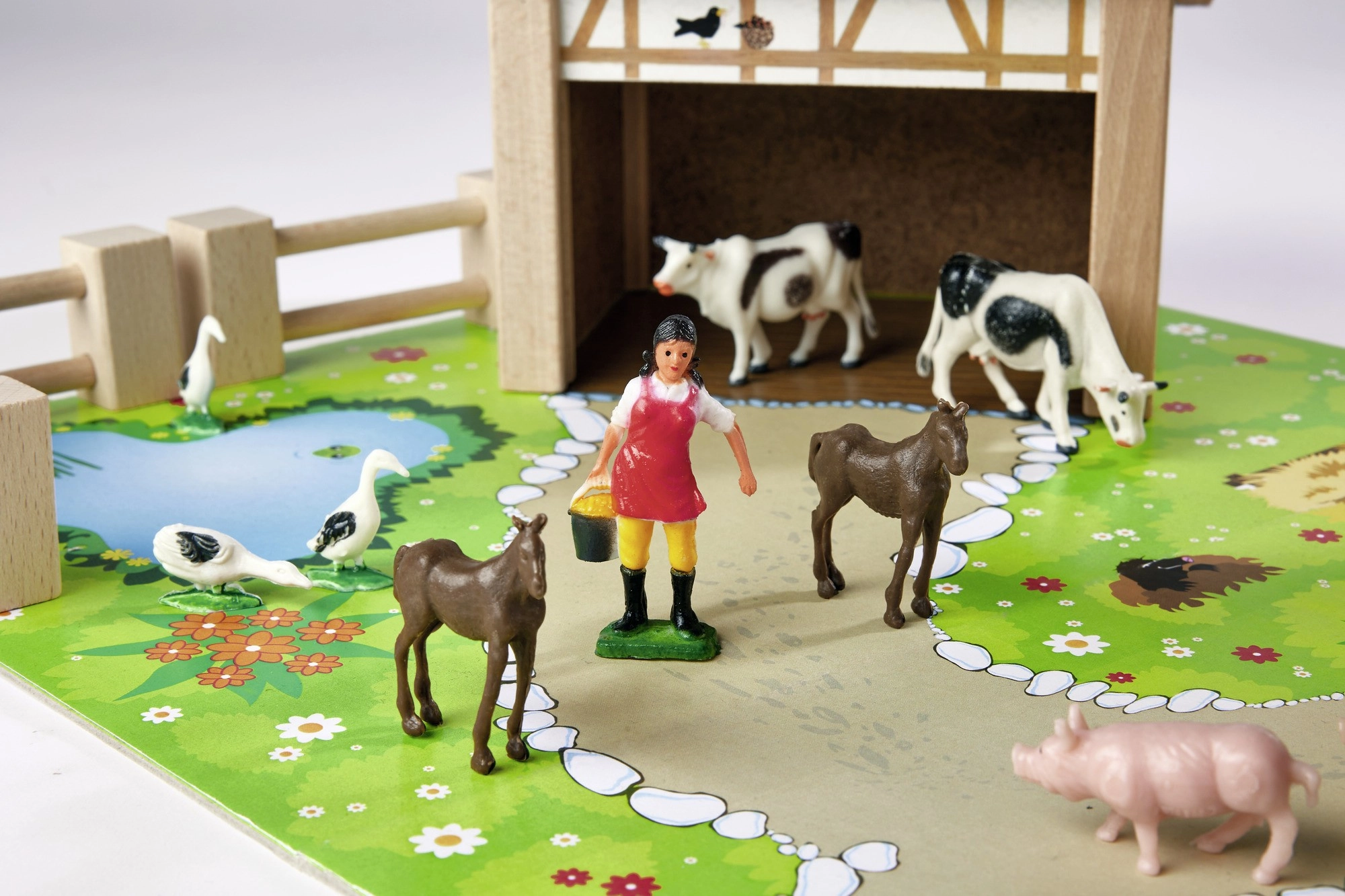 Sastav čini velika kuća s ograđenim prostorom i stajom, šarena podloga 51 × 36 cm, ograde i 12 figurica životinja i farmera. Igračka podržava koordinaciju, učenje boja i oblika te upoznavanje domaćih životinja.