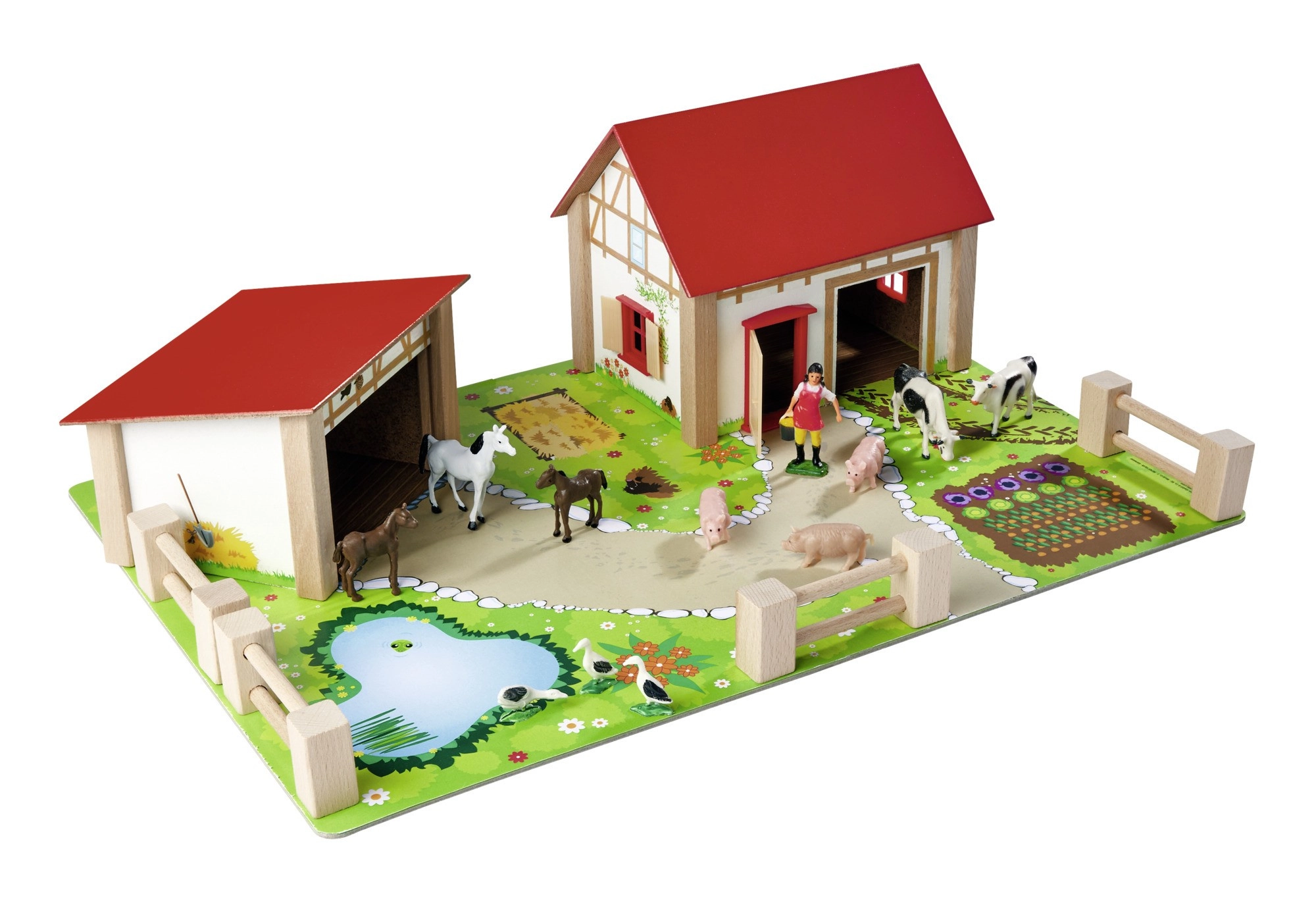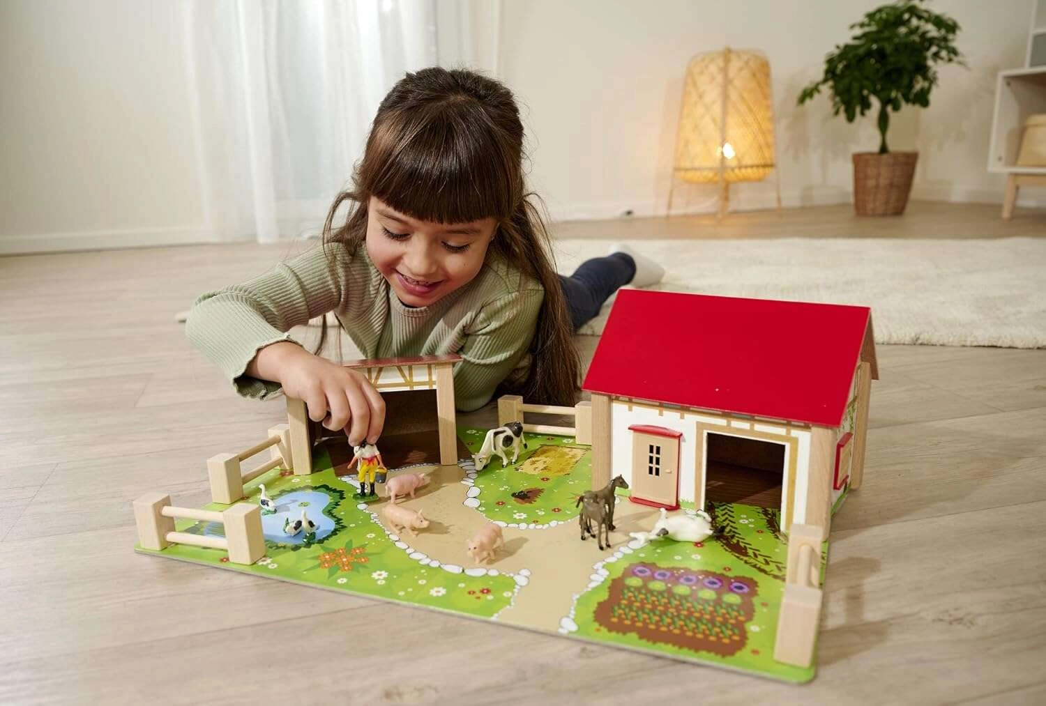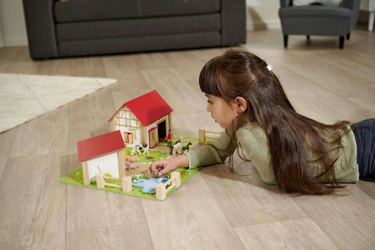 Djeca postaju mali farmeri: premještaju životinje u ograde, otvaraju vrata staje i brinu o vrtu. Drvena farma EICHHORN ističe se kvalitetnom izradom, ugodnim bojama i sigurnim materijalima za radosnu i dugotrajnu igru.