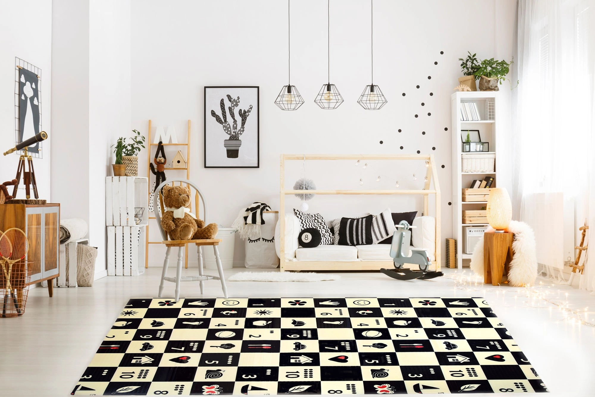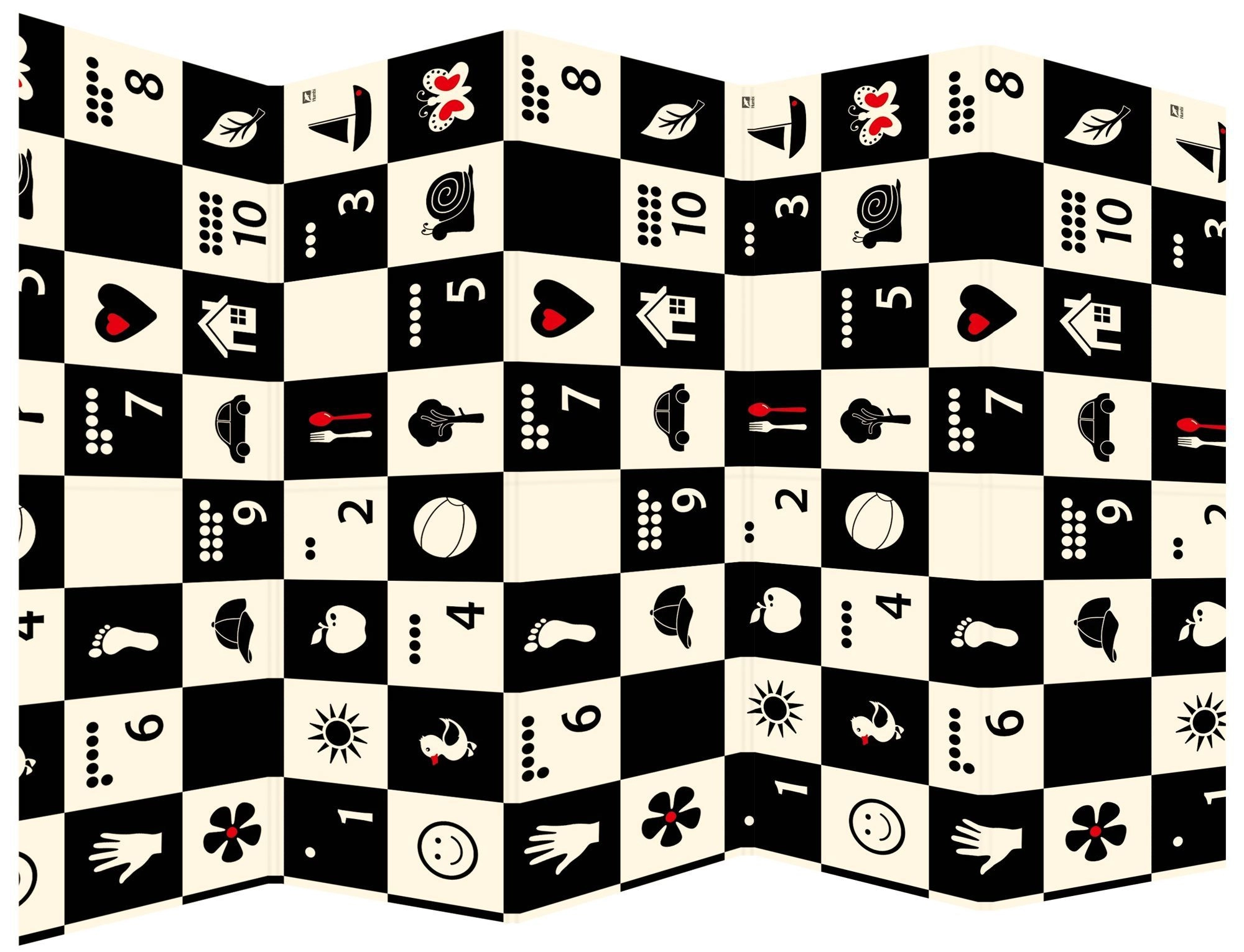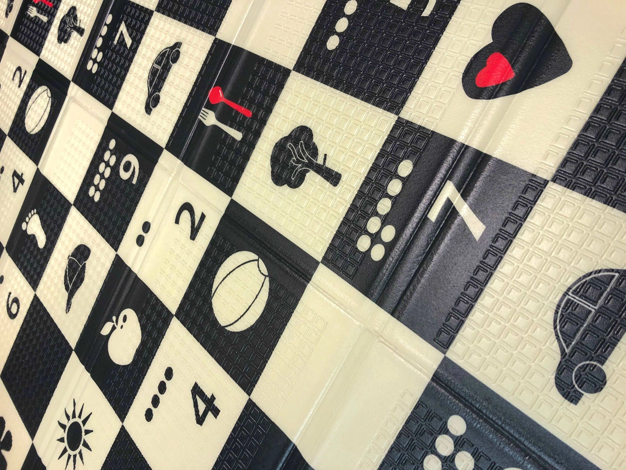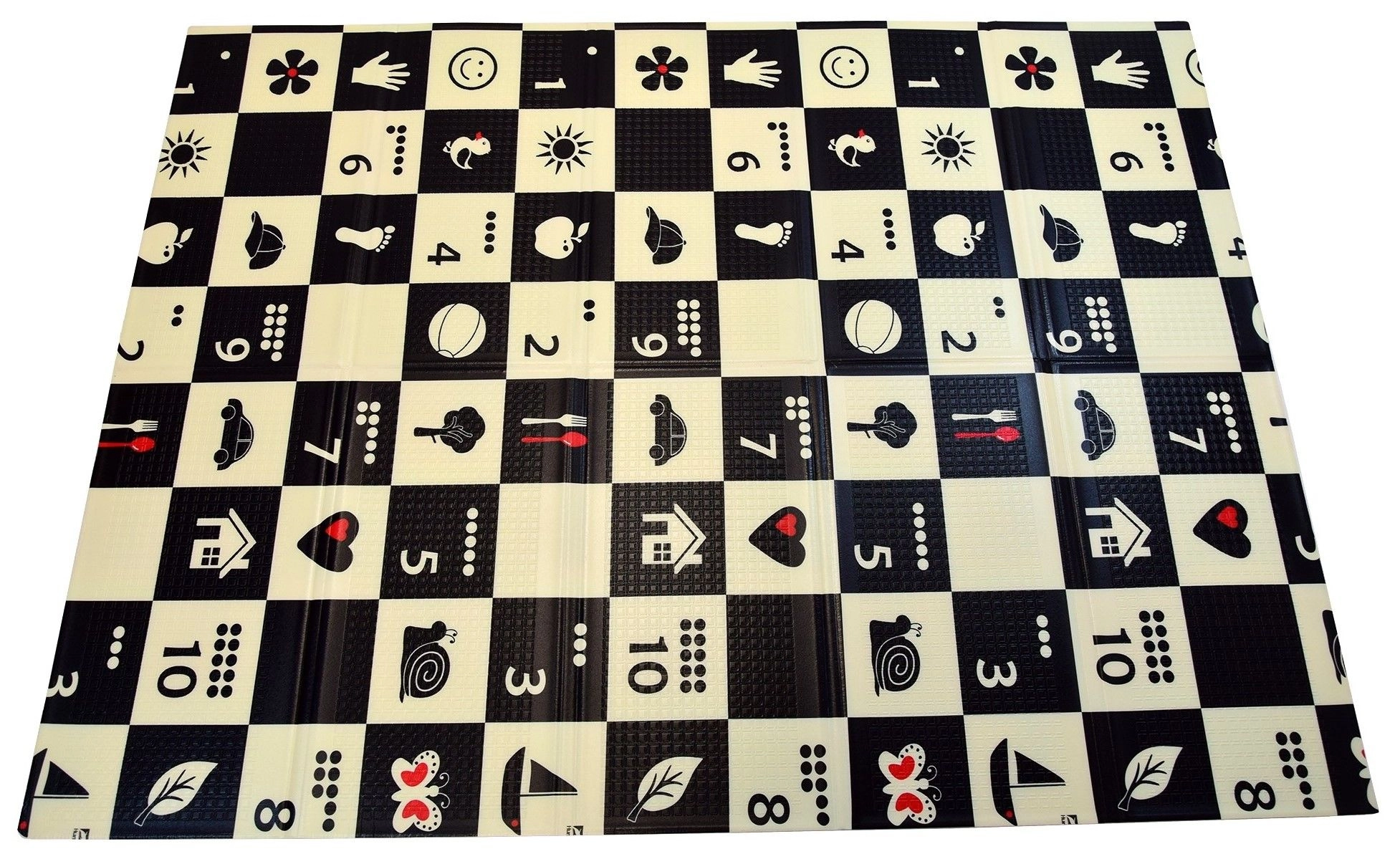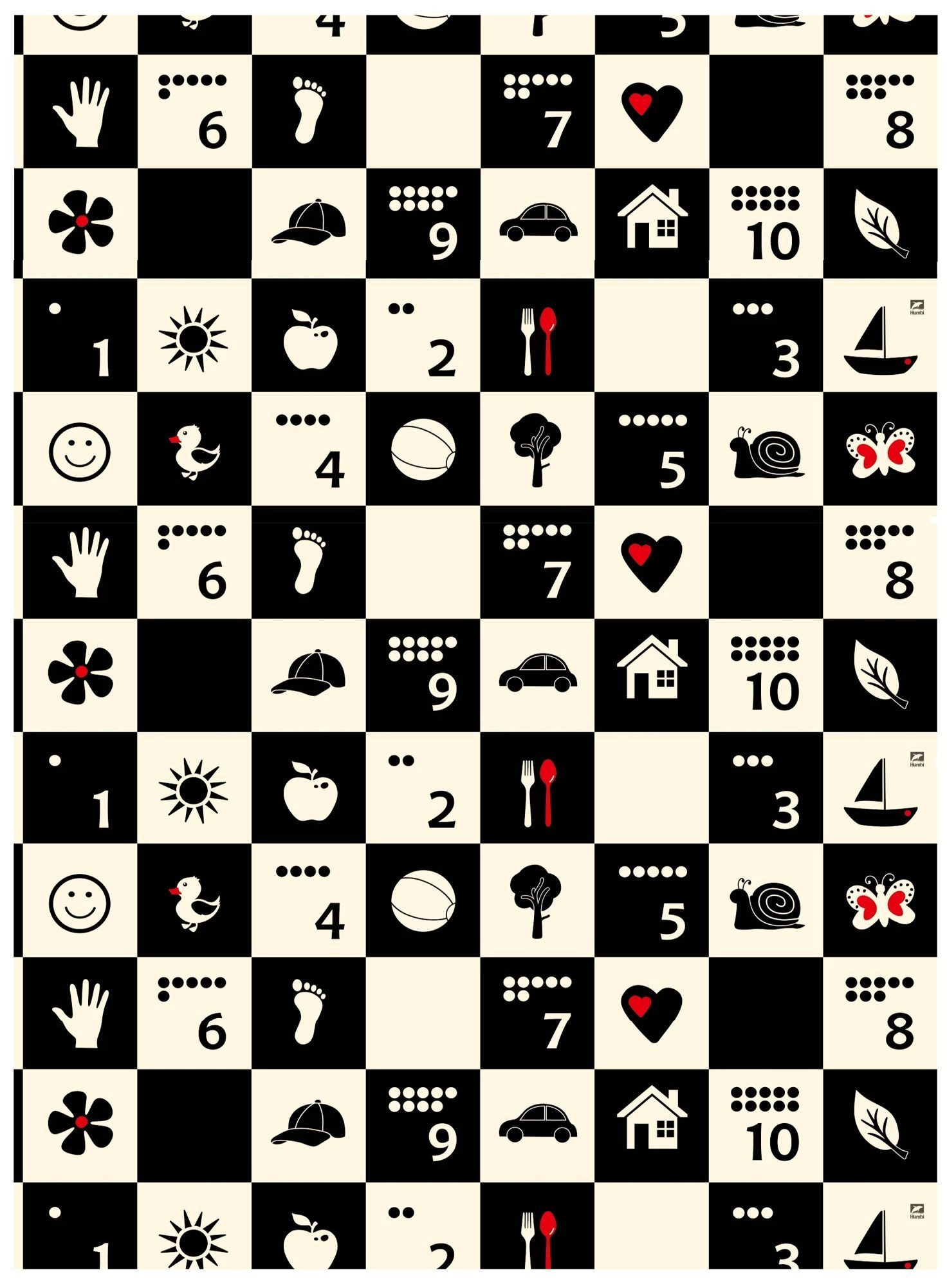 Crno-bijela šahovnica s jednostavnim ikonama stimulira vid, potiče vizualno-prostornu inteligenciju i privlači pažnju beba.