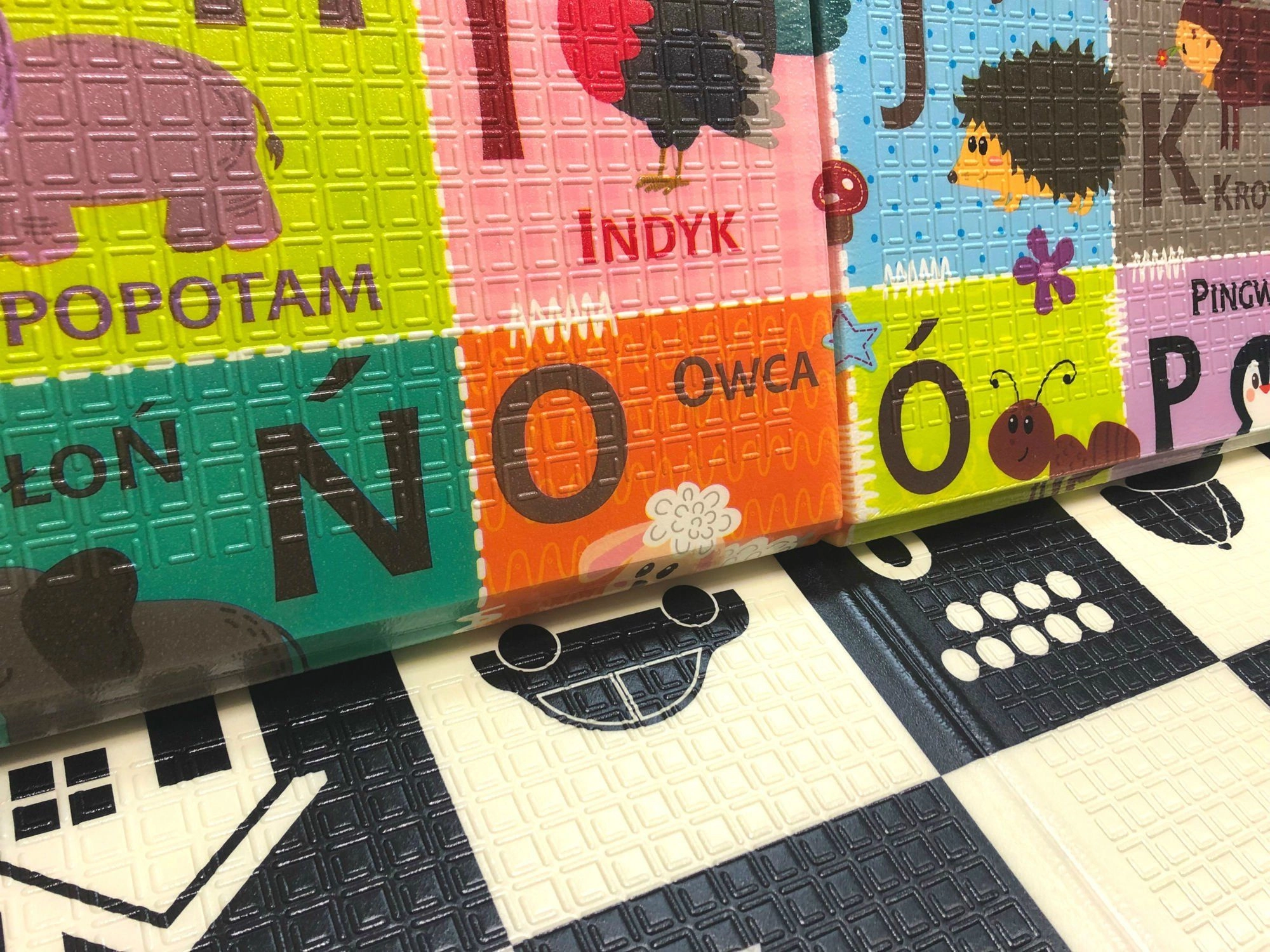Otkrijte praktičnu i sigurnu podlogu za djecu od rođenja: obostrana pjenasta podloga HUMBI dimenzija 197 × 177 × 1 cm kombinira poljsku/slikovnu abecedu, brojeve s točkama i kontrastne motive za razvoj vida i učenja. Mekana je, vodootporna, bez mirisa, izrađena od XPE materijala koji ublažava udarce i izolira hladnoću poda. Lako se sklapa, čisti i idealna je za igru, puzanje i prve korake.