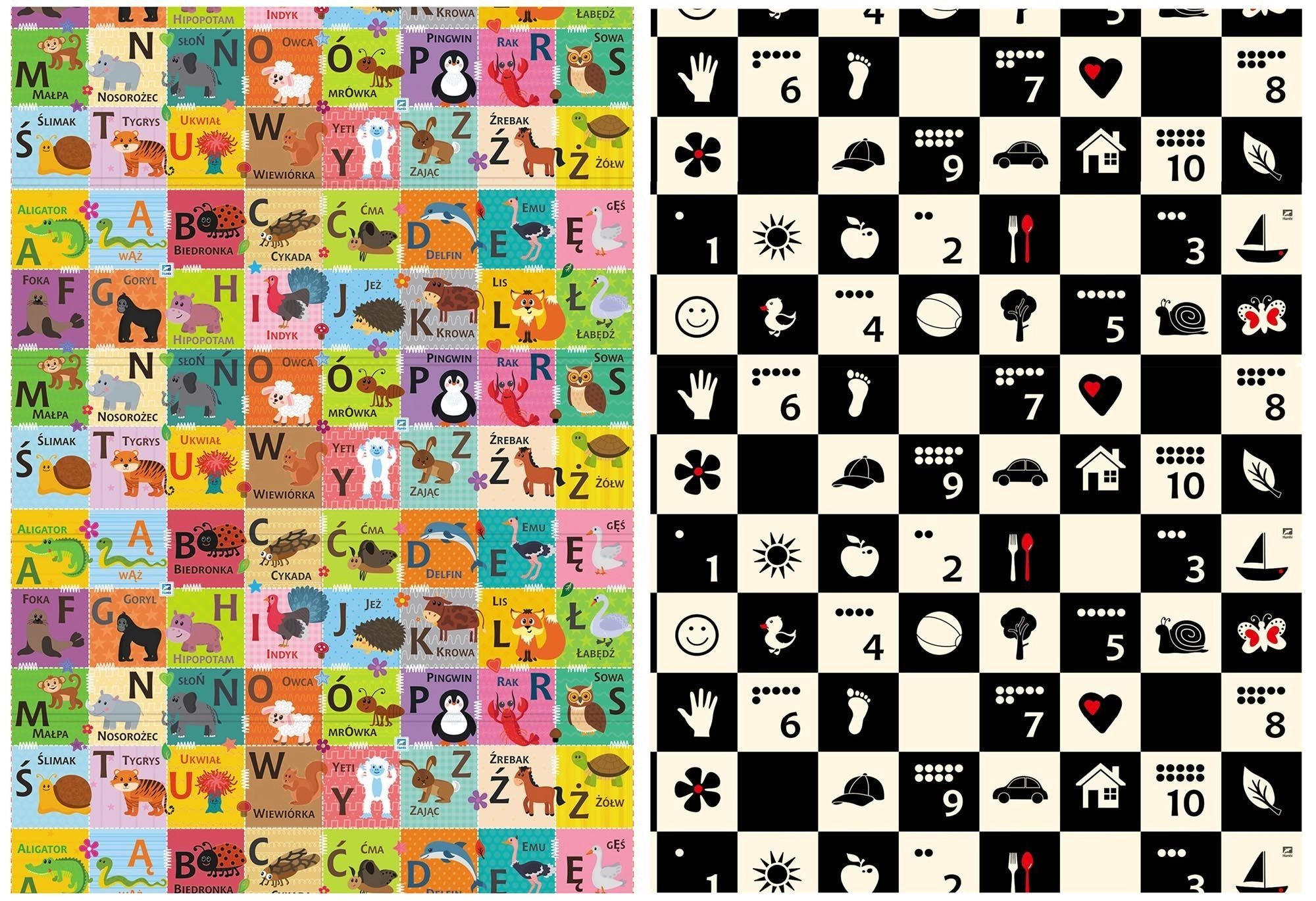 - Obostrani dizajn: kontrastni brojevi i simboli + šarena abeceda sa životinjama