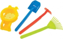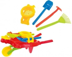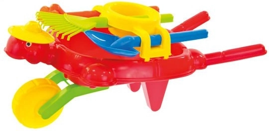 Veliki, pokretni kotač osigurava glatku i stabilnu vožnju po različitim podlogama, dok dvostruke potpore omogućuju sigurno odlaganje tačke. Ergonomske ručke prilagođene su dječjim dlanovima i podupiru siguran hvat. U pakiranju se nalaze i praktični dodaci: grabulje, lopatica, motika i sito – idealni za prenošenje zemlje, skupljanje lišća ili prosijavanje pijeska.