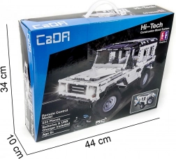 CaDA Hi‑Tech set odličan je izbor za male i velike graditelje koji vole izazove. Bijeli off‑road u stilu Jeepa nudi čvrstu konstrukciju, otvorive elemente i glatko upravljanje preko 2,4 GHz. Nakon sastavljanja model postiže do 6,3 km/h, a zahvaljujući pouzdanoj radijskoj vezi uživat ćete u glatkoj vožnji naprijed, natrag i skretanju.