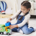Bočna i prednja ruka lako podižu plavu reciklažnu košaru i istresaju sadržaj u sanduk. Djeca doživljavaju realistično utovarivanje i istovarivanje.