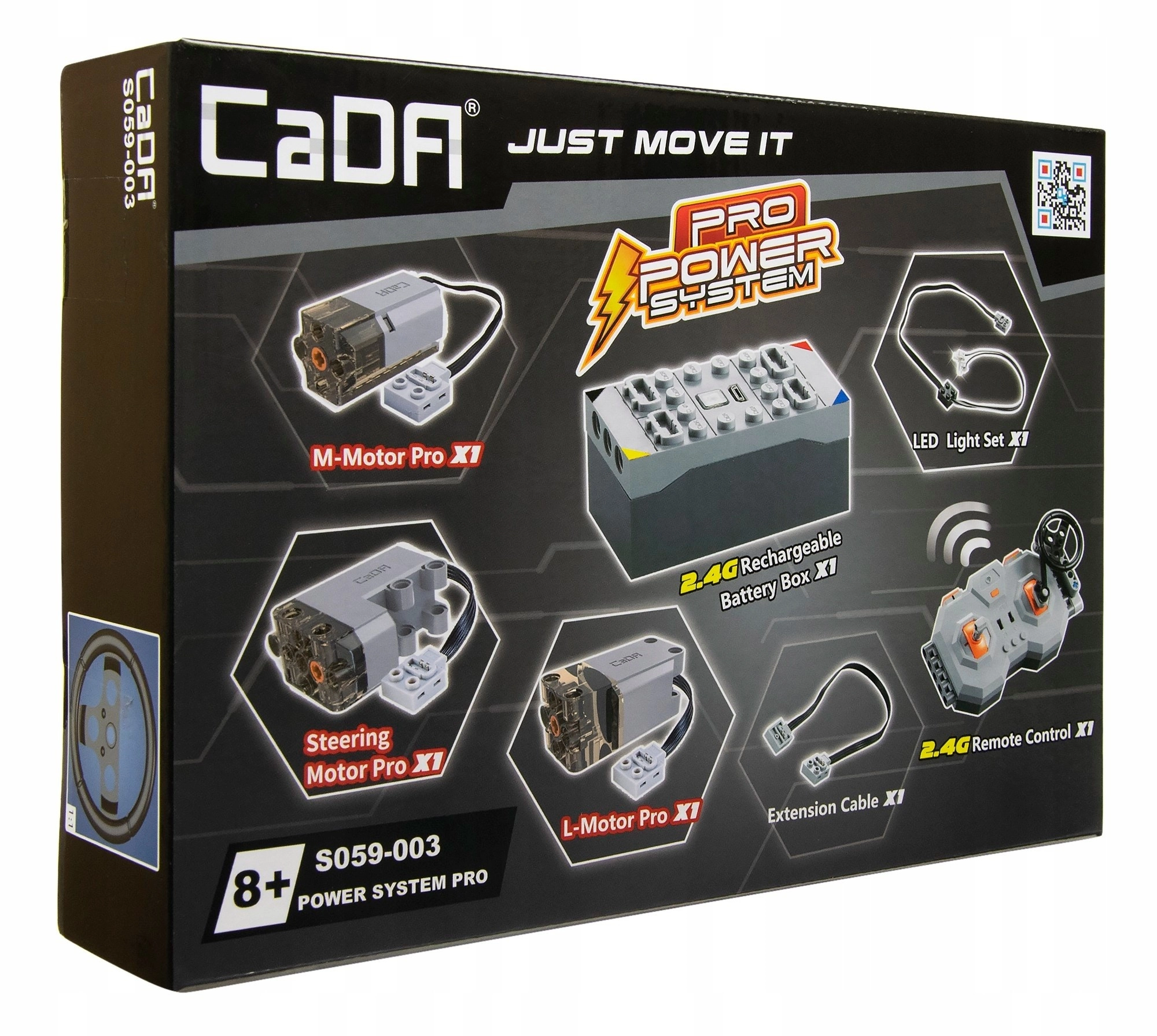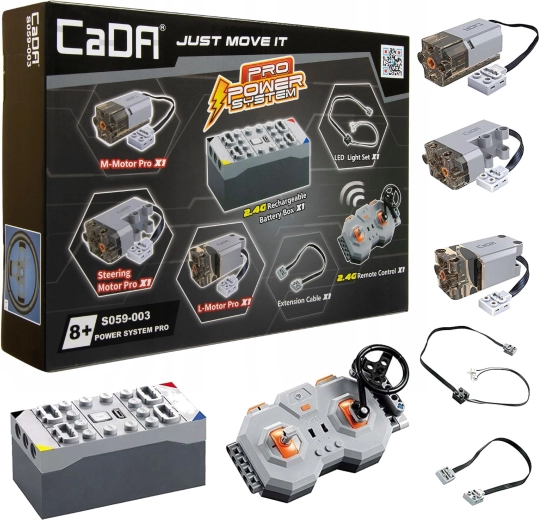 Set Pro Power System daje vašim CaDA setovima pravi pogon i upravljivost. Zahvaljujući kombinaciji motora, servo upravljanja, baterije i 2,4 GHz daljinskog upravljača možete voziti naprijed i natrag, skretati, uključivati/isključivati LED svjetla te kod odabranih modela i otvarati ili zatvarati vrata. Idealno za graditelje koji žele statične modele pretvoriti u potpuno funkcionalna RC vozila.