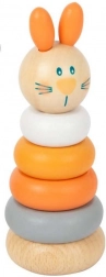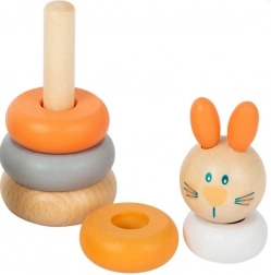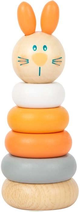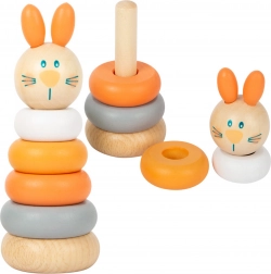 Preslatki drveni toranj u obliku zeca brenda SMALL FOOT potiče finu motoriku, koordinaciju oko–ruka te učenje boja, oblika i veličina. Djeca od 12 mjeseci nižu šarene prstenove na kolčić i završavaju glavicom zeca. Glatki, zaobljeni dijelovi od kvalitetnog drva sigurni su za male ruke.