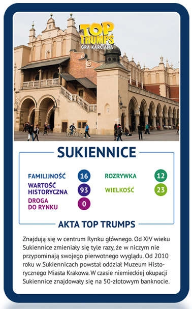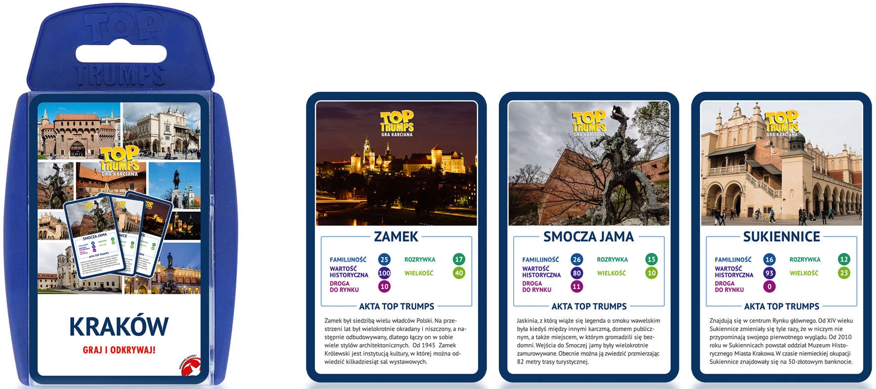 Otkrijte brzu i zabavnu kartašku igru TOP TRUMPS Krakov, idealnu za putovanja i kod kuće. Jednostavna pravila, napeto uspoređivanje vrijednosti i 33 karte u praktičnom etuiju jamče zabavu za djecu i odrasle. Odličan izbor za najmanje 2 igrača, od 6 godina i s vremenom igranja oko 15 minuta.