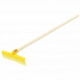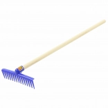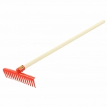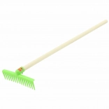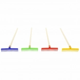 Drvena drška i plastična glava čine uravnotežen, lagan alat s kojim se djeca lako snalaze pri igri i laganom grabljanju.