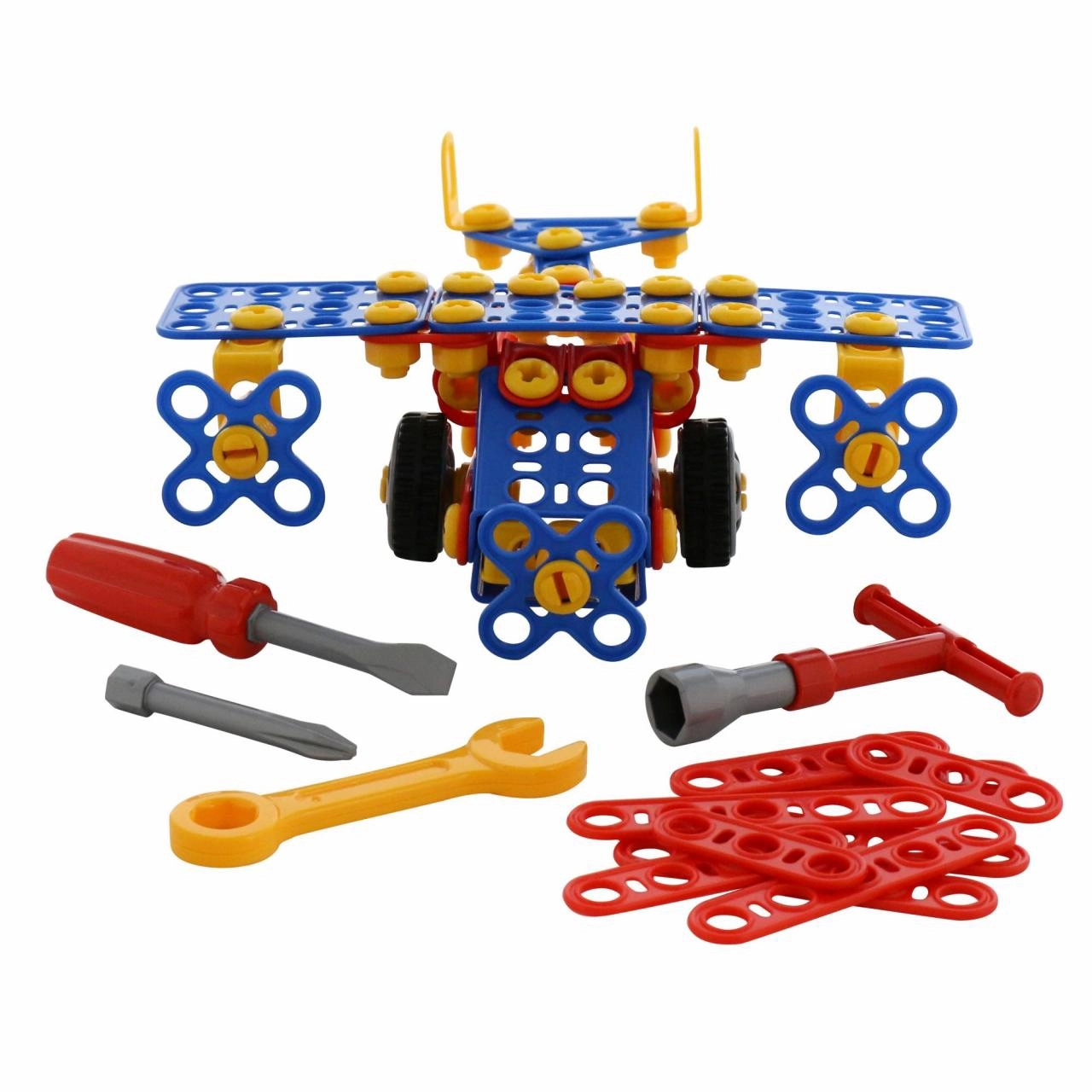 Ovaj šareni konstrukcijski set omogućuje djeci da sastave avion i druge jednostavne modele od perforiranih elemenata, spojnih dijelova i kotačića. U pakiranju su i plastični alati (odvijač, ključ) uz koje djeca sigurno mogu isprobati pravo vijčanje.