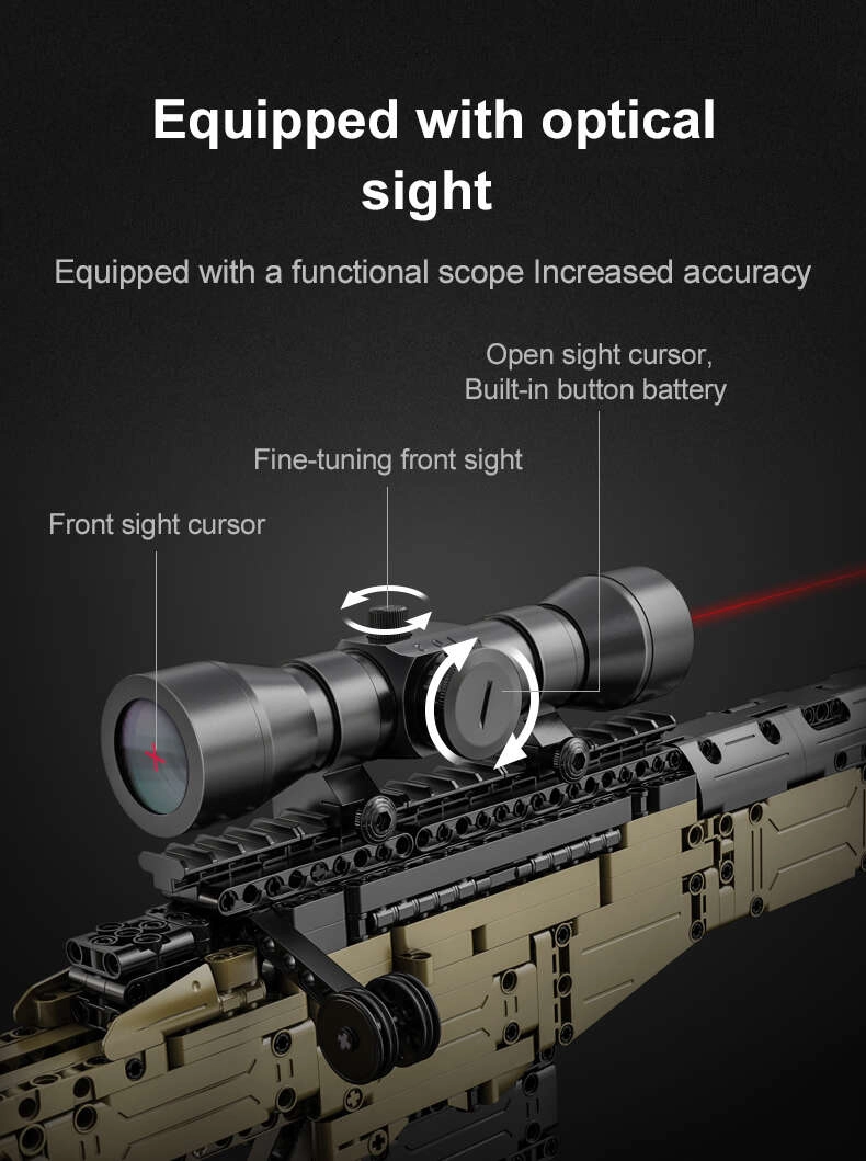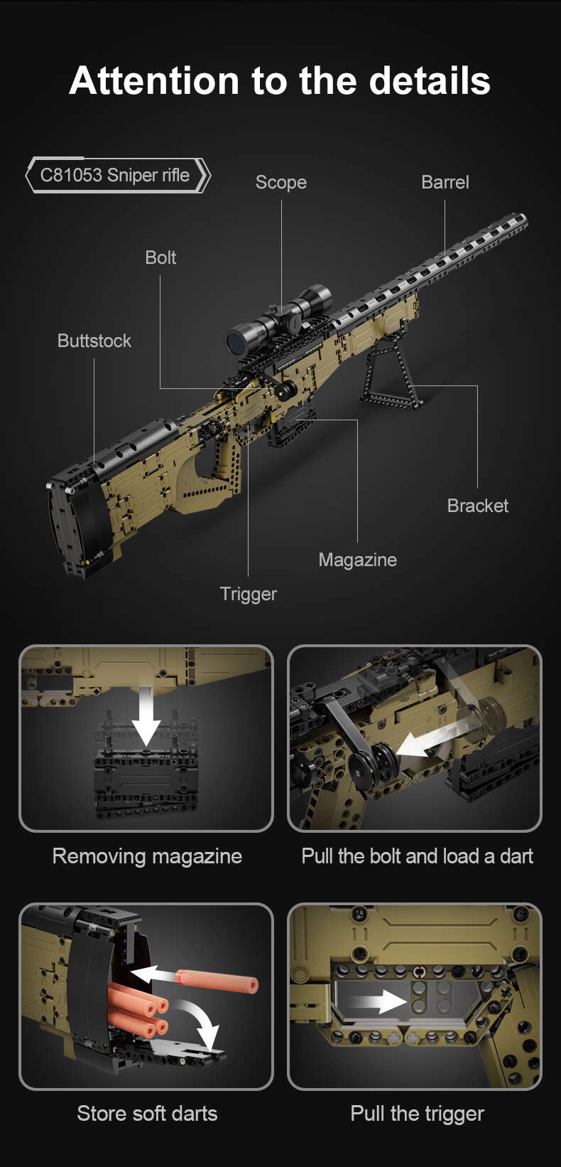 Ovaj detaljan set brenda DOUBLE EAGLE/CADA donosi atraktivan projekt za stariju djecu i tinejdžere. Sastavit ćete dojmljiv model snajperske puške SNIPER RIFLE s mnogo pokretnih dijelova, uključujući spremnik i optički nišan. Zahvaljujući priloženom remenu, model je lako prenosiv.