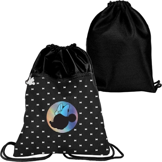 Stilna sportska vreća s motivom MINNIE MOUSE u elegantnoj crnoj boji i holografskim tiskom. Lagana konstrukcija, prostrana glavna komora na zatezanje i džep s patentnim zatvaračem za sitnice. Stražnji dio je radi udobnosti učvršćen i prozračen mrežicom, a čvrste pletene vezice omogućuju udobno nošenje na leđima ili preko ramena.