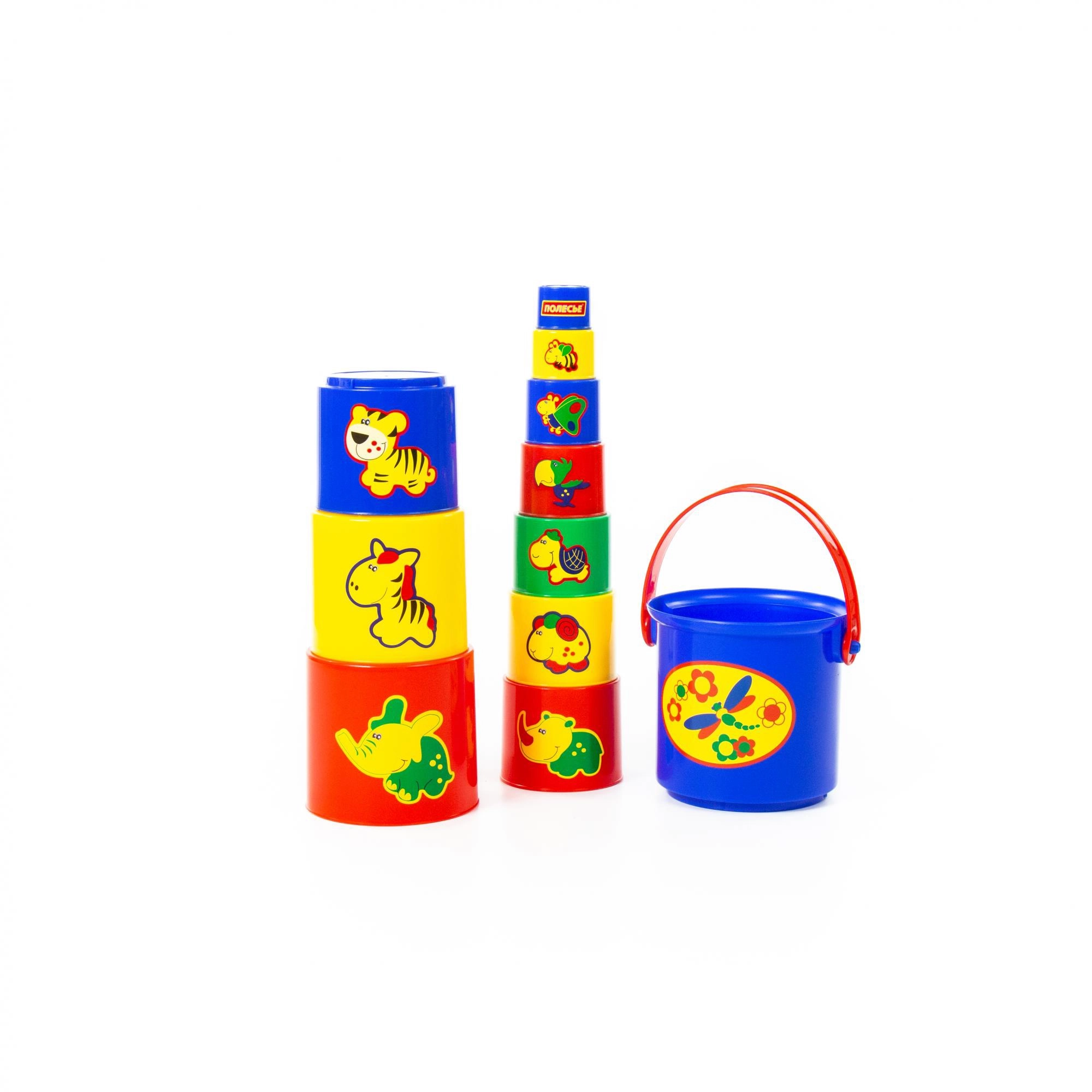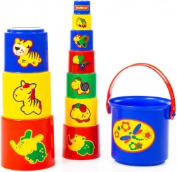 Sve je praktično spremljeno u kantu promjera 14 cm, pa se igračka lako prenosi i posprema. Jarke boje i ilustracije životinja potiču prepoznavanje boja i učenje veličina – od najmanjeg do najvećeg dijela.