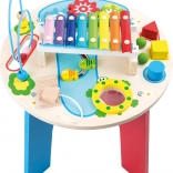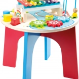 Robustan i šaren drveni motorički glazbeni stol za djecu, pun interaktivnih elemenata koji potiču glazbeni odgoj i razvoj fine motorike.