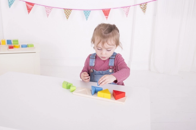 Jednostavni oblici i jarke boje (crvena, plava, zelena, žuta) podupiru vizualnu percepciju i logičko razvrstavanje. Umetanje u odgovarajuće pozicije jača pravilno povezivanje.
