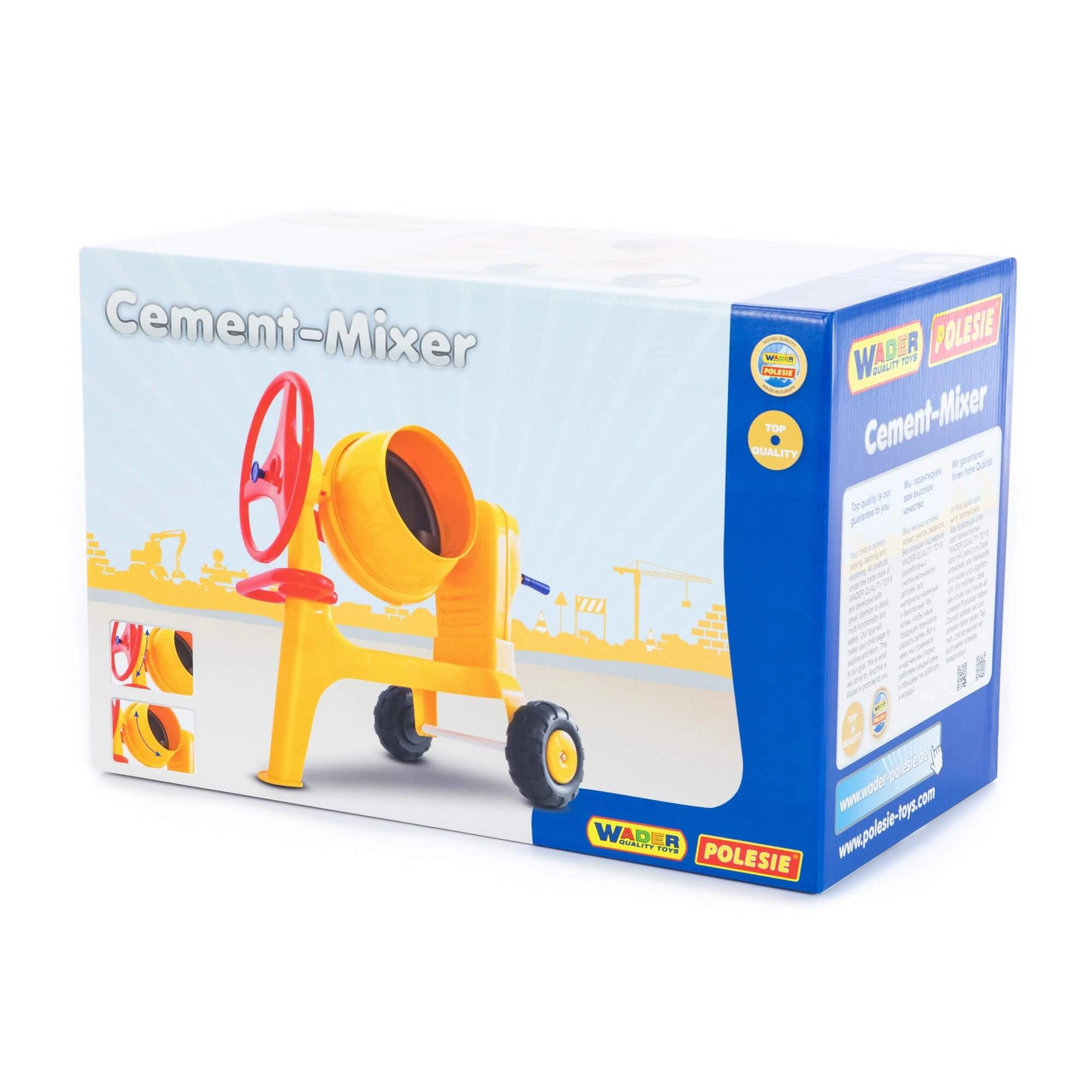 Dječja miješalica za beton marke WADER je realistična igračka koja djeci omogućuje da se osjećaju kao mali graditelji. Ima rotirajući miješajući bubanj pokretan ručicom, mehanizam za naginjanje s aretacijom i pokretne kotače. Prikladna je za igru kod kuće i na pijesku te je certificirana od 1. godine.