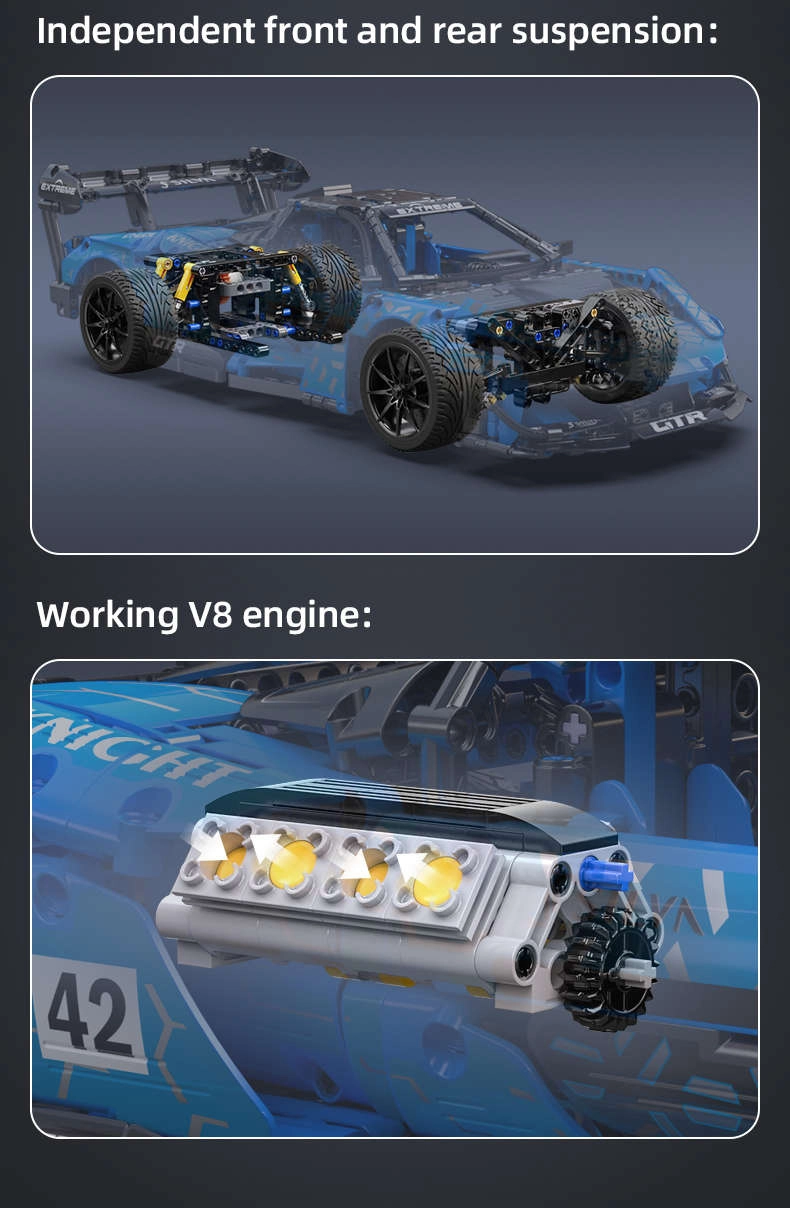 Model se može proširiti RC komponentama (nisu u pakiranju): baterija 7,4 V, daljinski upravljač, L pro motor, pro servomotor i LED osvjetljenje. Nakon dodavanja RC-a vozit će naprijed/natrag, skretati lijevo/desno i omogućiti paljenje i gašenje prednjih i stražnjih svjetala. Vrata se otvaraju prema gore i zatvaraju pomoću okretnog kontrolera. U kompletu je jasan uputnik korak po korak, pa se modela mogu prihvatiti i mlađi graditelji uz pomoć odraslih.