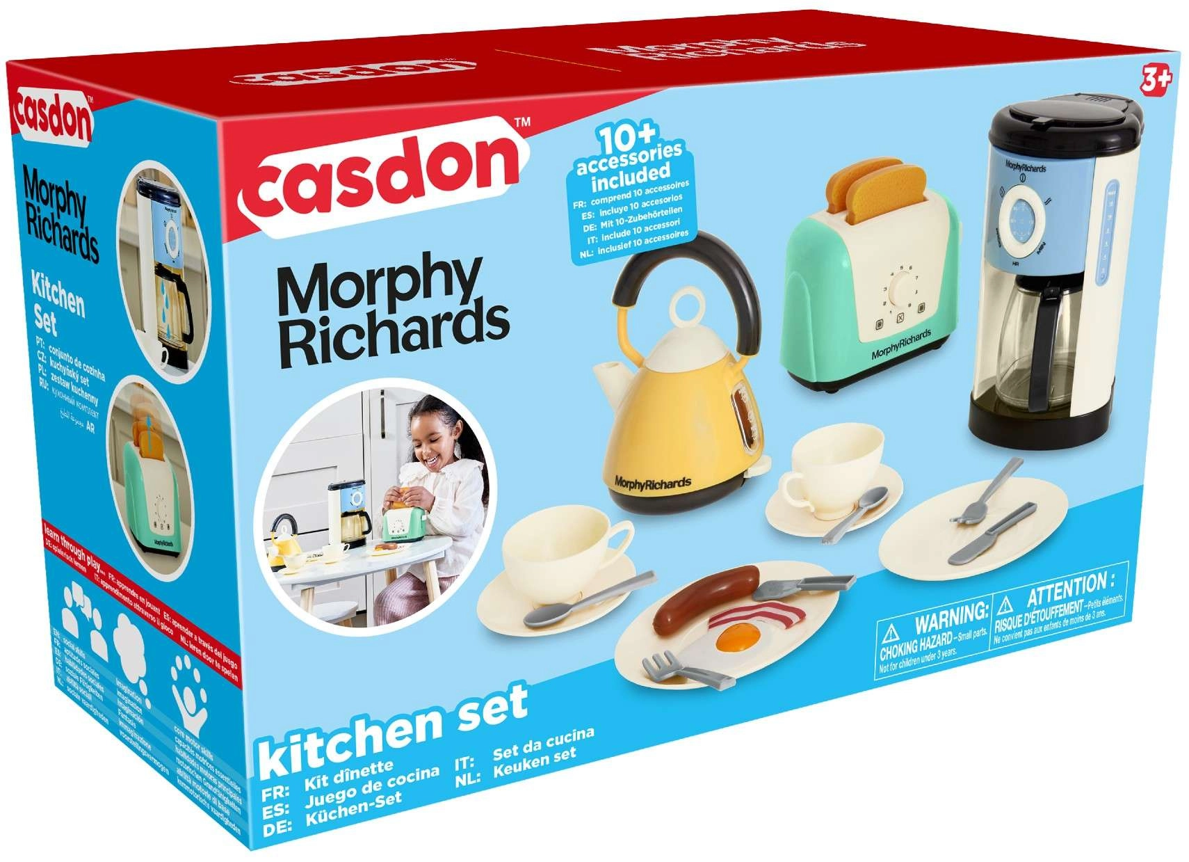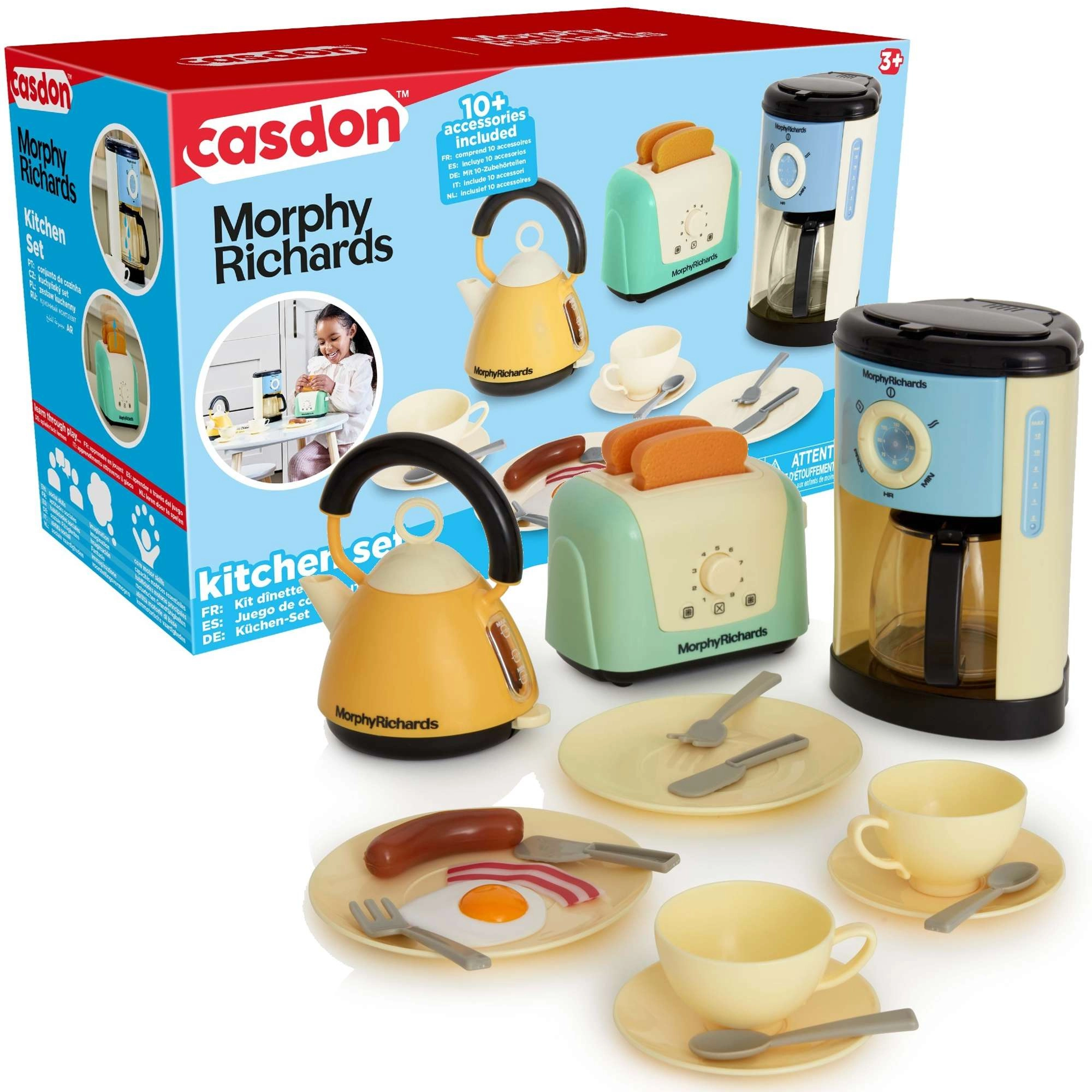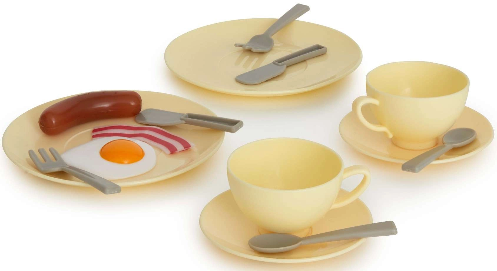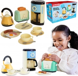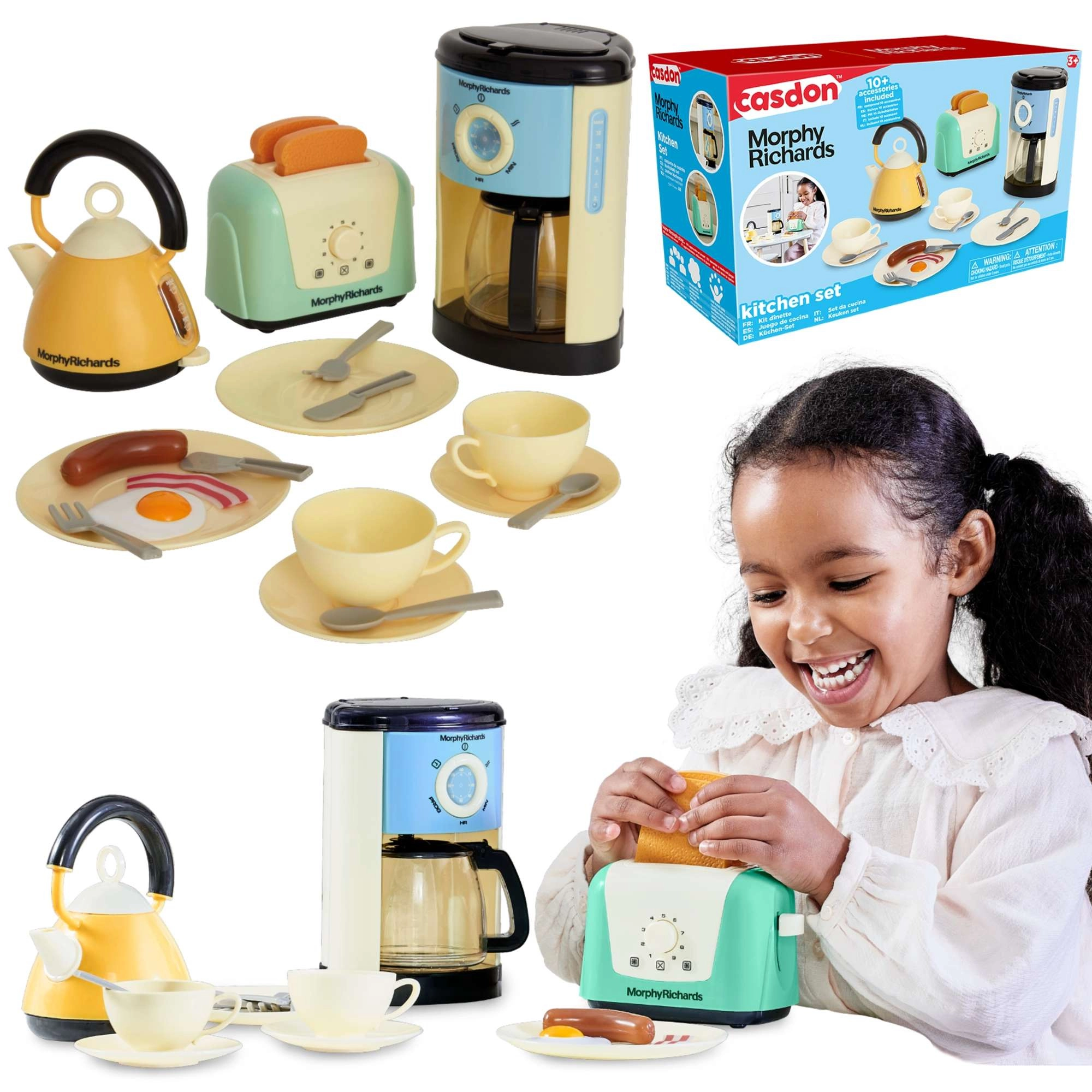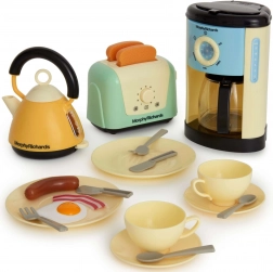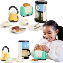 Ovaj dječji kuhinjski set modernog dizajna nudi sve što mali kuhari trebaju za pripremu “savršena doručka”. U kompletu su aparat za kavu s protokom vode i vrčem, kuhalo za vodu s udobnom ručkom i pokazivačem razine, toster s funkcijom iskakanja tosta, tanjuri, pribor, šalice s tanjurićima i set “namirnica” (tost, hrenovka, ploška slanine i jaje na oko).