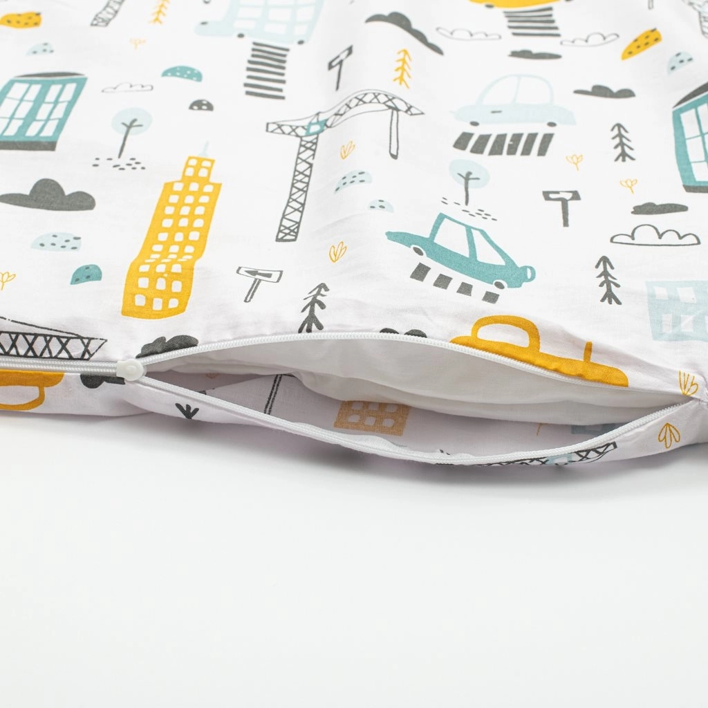 Udoban i siguran 3-dijelni set posteljine za dječji krevetić NEW BABY s motivom grada u goruščičnoj boji. Sadrži jastučnicu 40×60 cm, navlaku za poplun 120×90 cm i zaštitnu ogradicu 31×175 cm. Izrađeno od 100% pamuka za mekoću, prozračnost i osjetljivu dječju kožu. Praktični sigurnosni patentni zatvarači bez visećih završetaka i antialergijski materijali osiguravaju miran i siguran san.