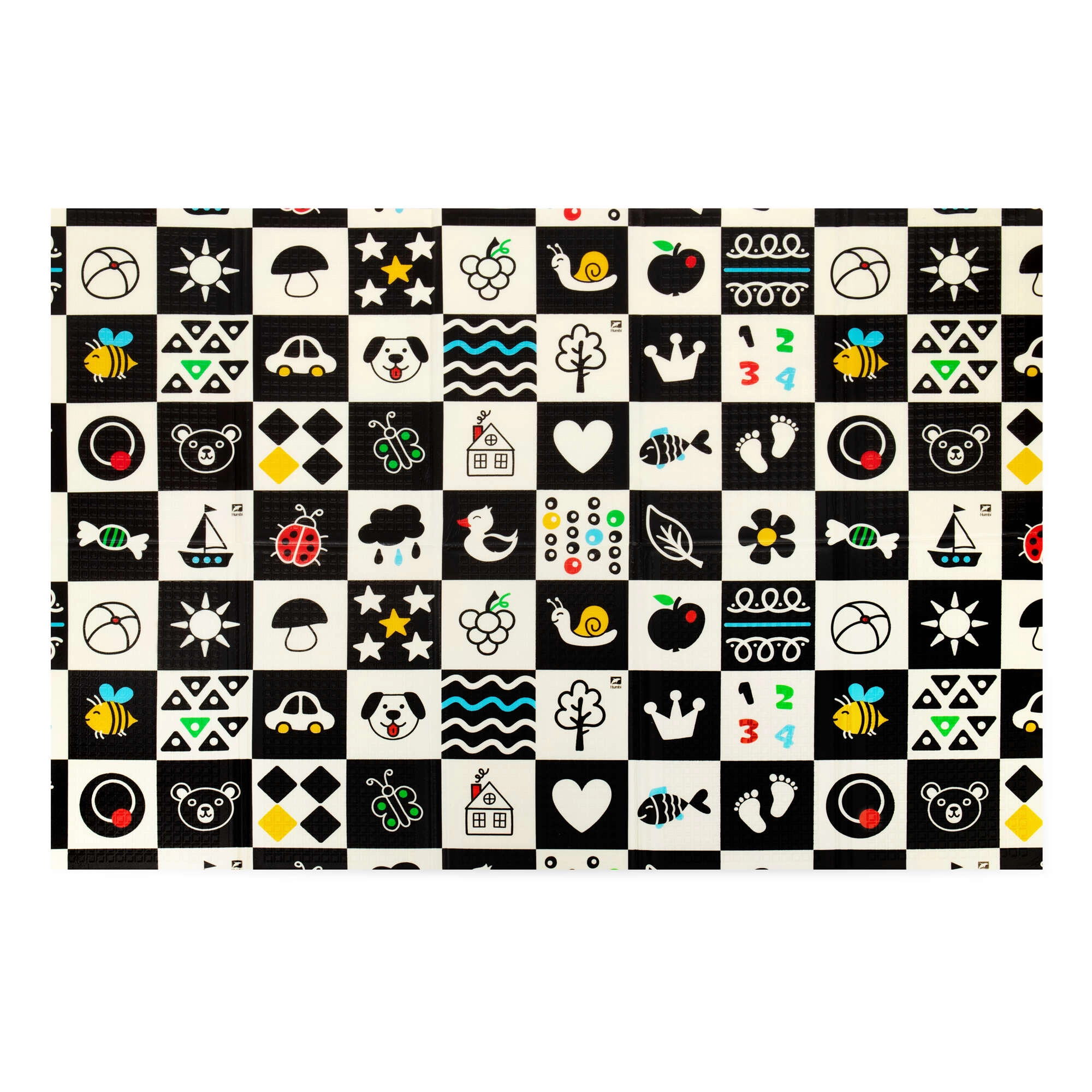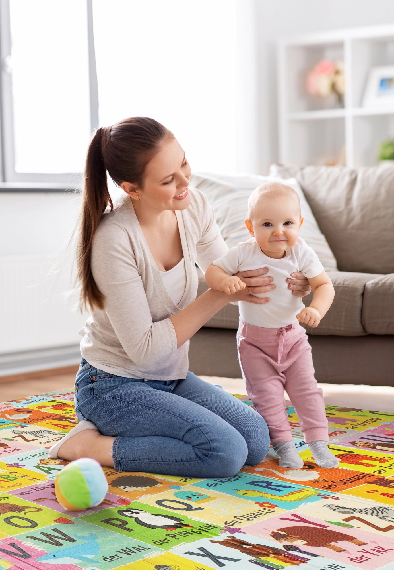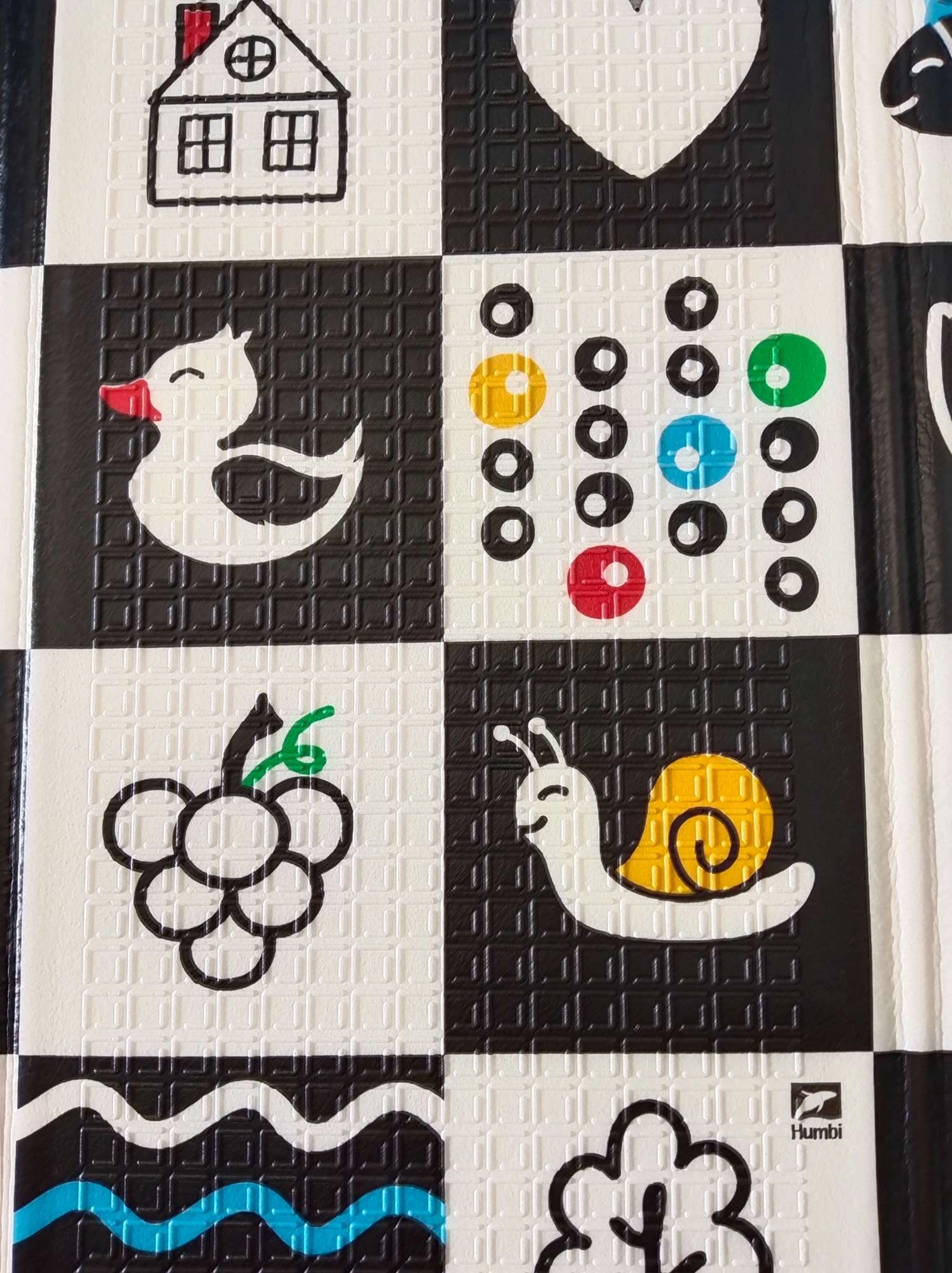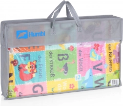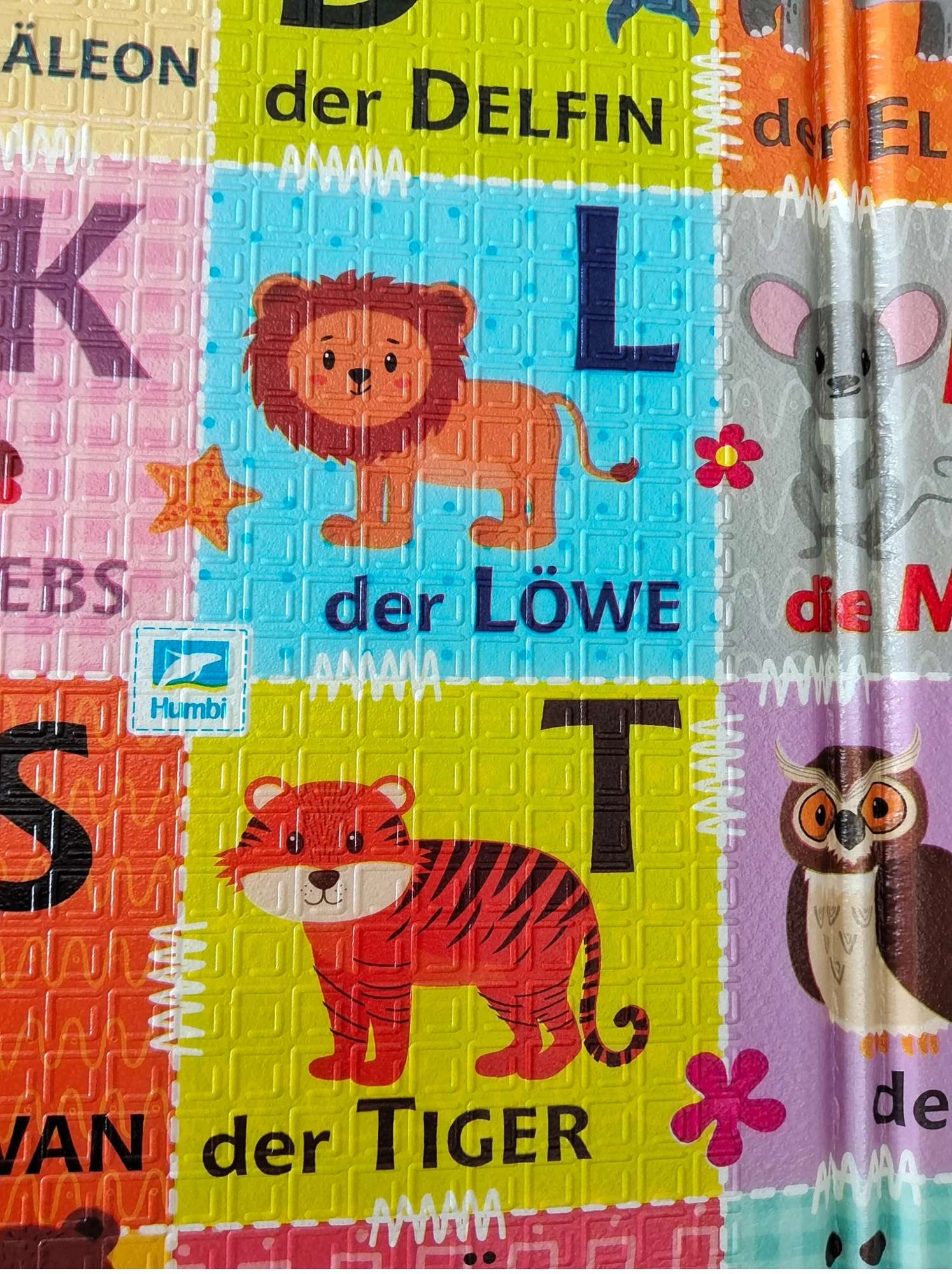Podloga HUMBI od kvalitetne XPE pjene stvara siguran i udoban prostor za bebe i malu djecu. Zahvaljujući debljini od 0,8 cm učinkovito ublažava padove i štiti koljena pri puzanju. Dvostrani dizajn donosi i zabavno učenje slova na njemačkom, kao i kontrastne crno-bijele motive koji podupiru koncentraciju i razvoj vida.