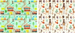 Dvije edukativne grafike potiču razvoj mašte i učenja: simpatične šumske životinje i šarene uličice na tirkiznoj podlozi.