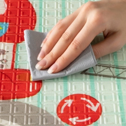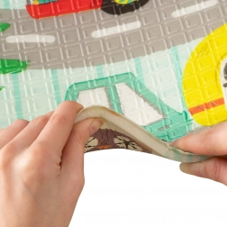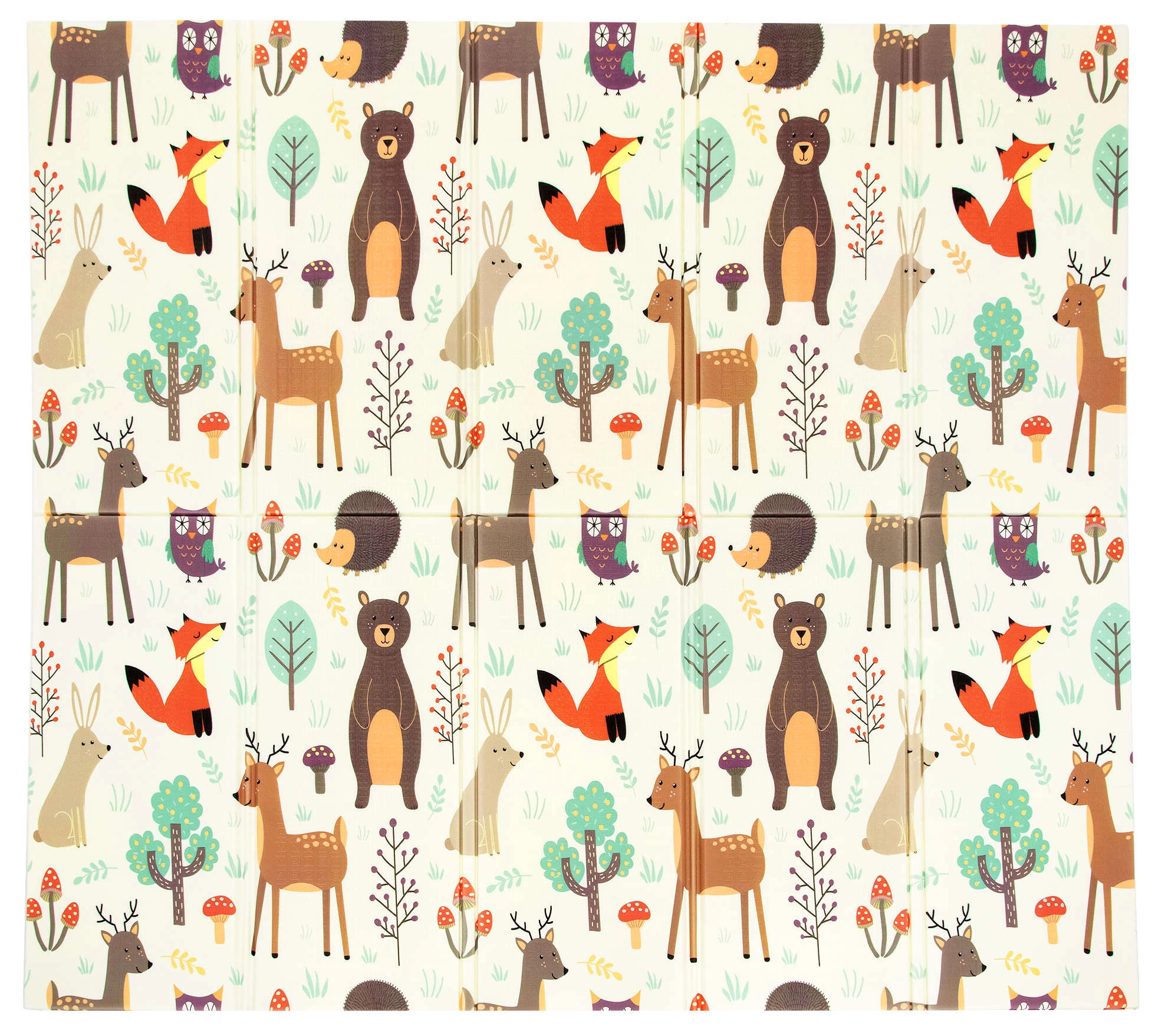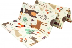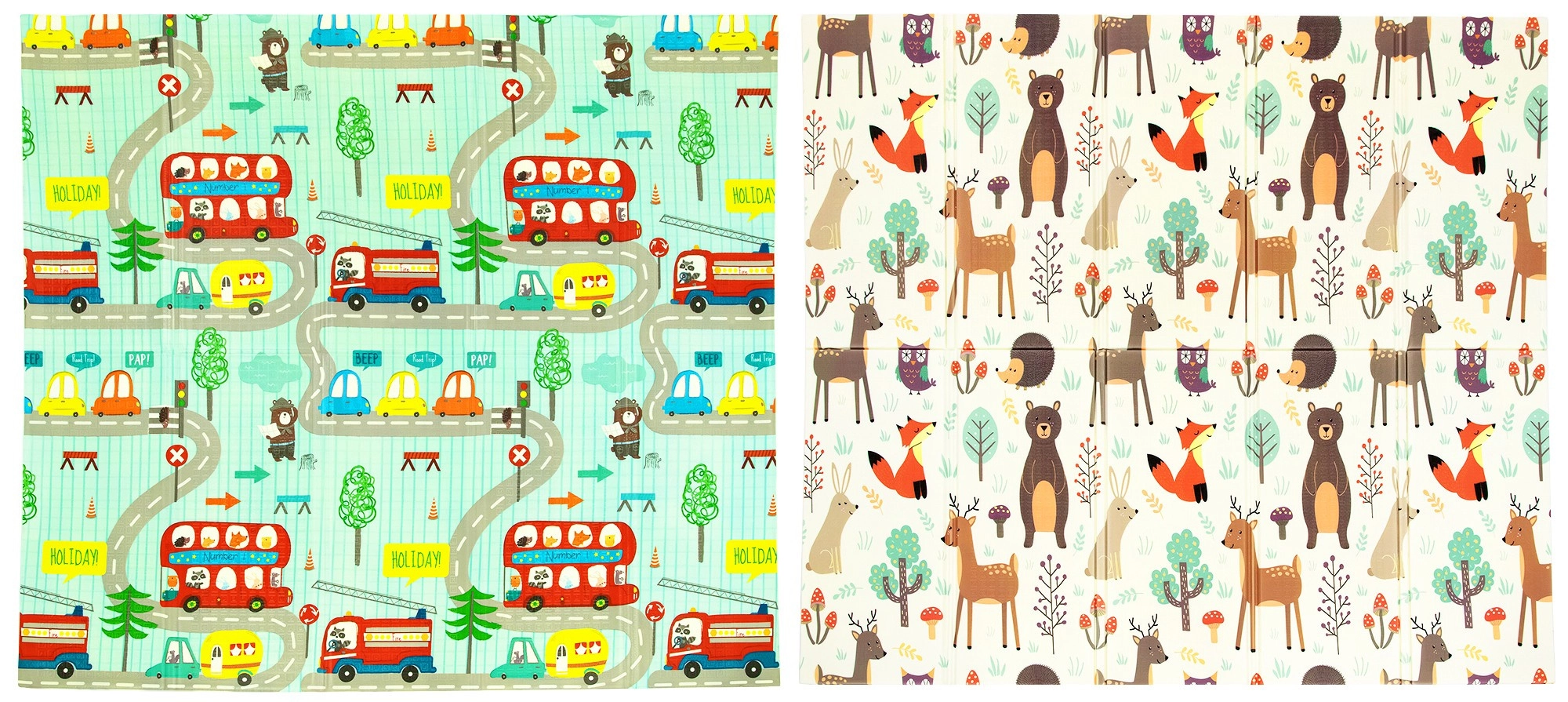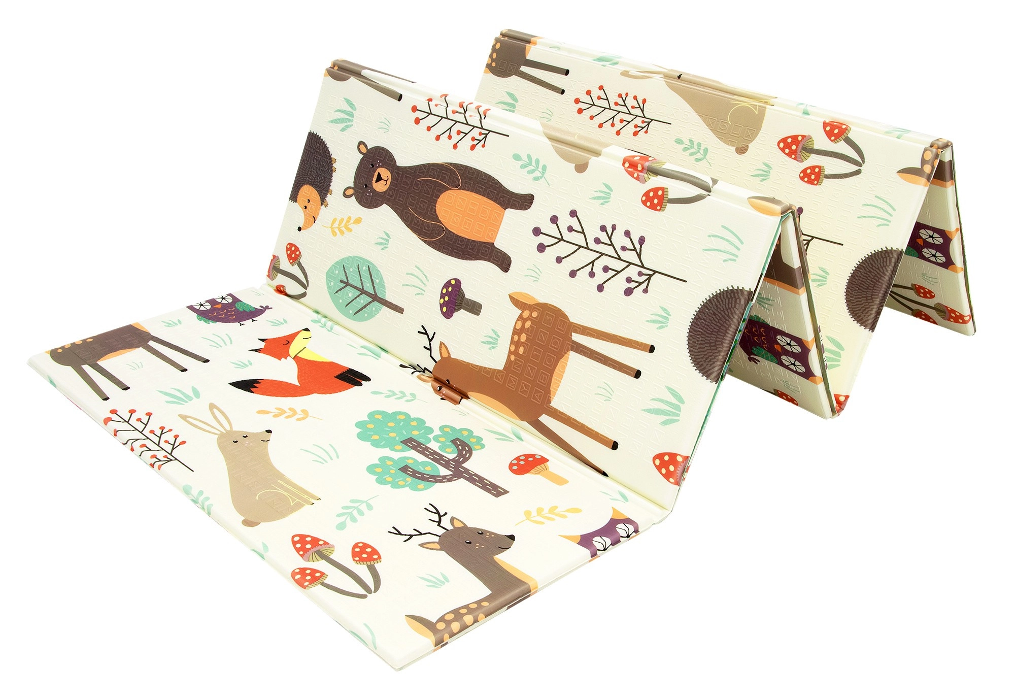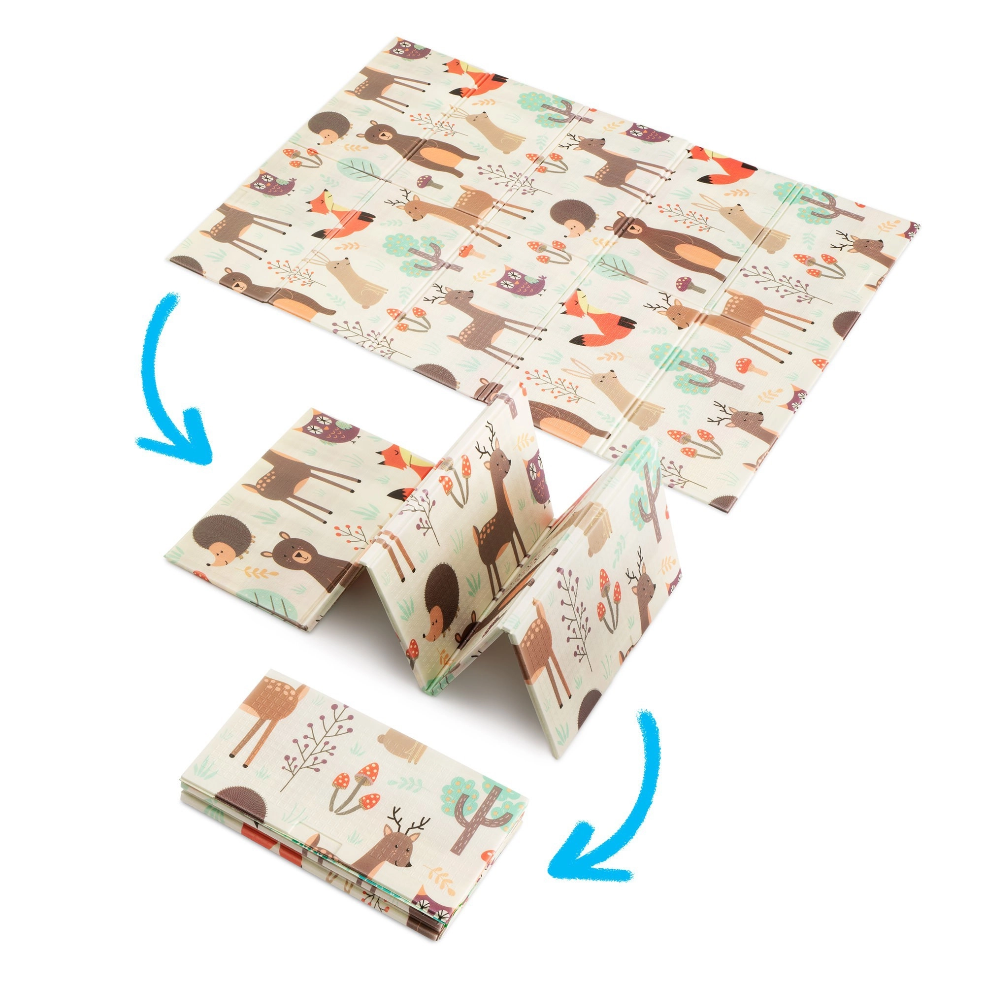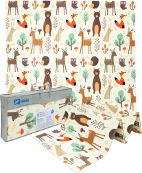 Podloga je obostrana: jedna strana donosi nježne motive šumskih životinja, druga zabavne šarene uličice. Lako se sklapa u kompaktne dimenzije, lagana je i zahvaljujući torbi s patentnim zatvaračem i ručkama možete je ponijeti u dnevni boravak, dječju sobu, na vrt ili piknik. Vodootporna površina dovoljna je za brisanje vlažnom krpom – higijensko rješenje prikladno i za alergičare.