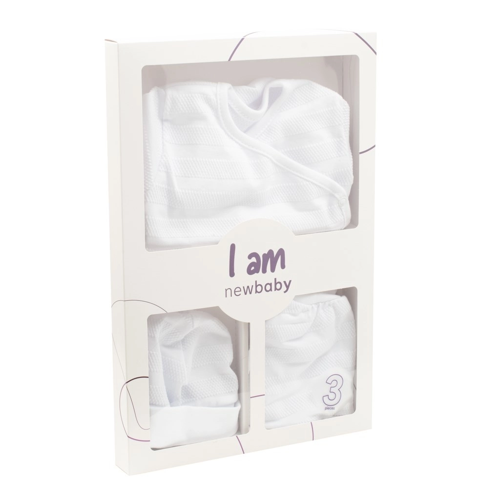 Presladak 3-dijelni set za bebe NEW BABY I AM u univerzalnoj bijeloj boji izrađen je od 100% mekane pamuke. Sadrži body na kopčanje cijelom dužinom s dugim rukavima, polu-tajice s stopicama (poludupače) i kapicu. Udobni krojevi, bočno kopčanje na drukere i širi elastični rubovi osiguravaju komfor od prvih dana. Sjajan izbor za rodilište i kao lijep poklon.