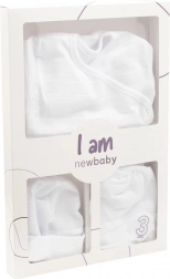 Stilizan i nježan 3-dijelni set za bebu NEW BABY I AM idealan je za rodilište i prve mjesece kod kuće. Sadrži body na potpuno kopčanje s dugim rukavima, polunogavice s mekim pojasom i udobnu kapicu. Izrađeno od 100% pamuka za maksimalnu udobnost i nježnost prema osjetljivoj koži.