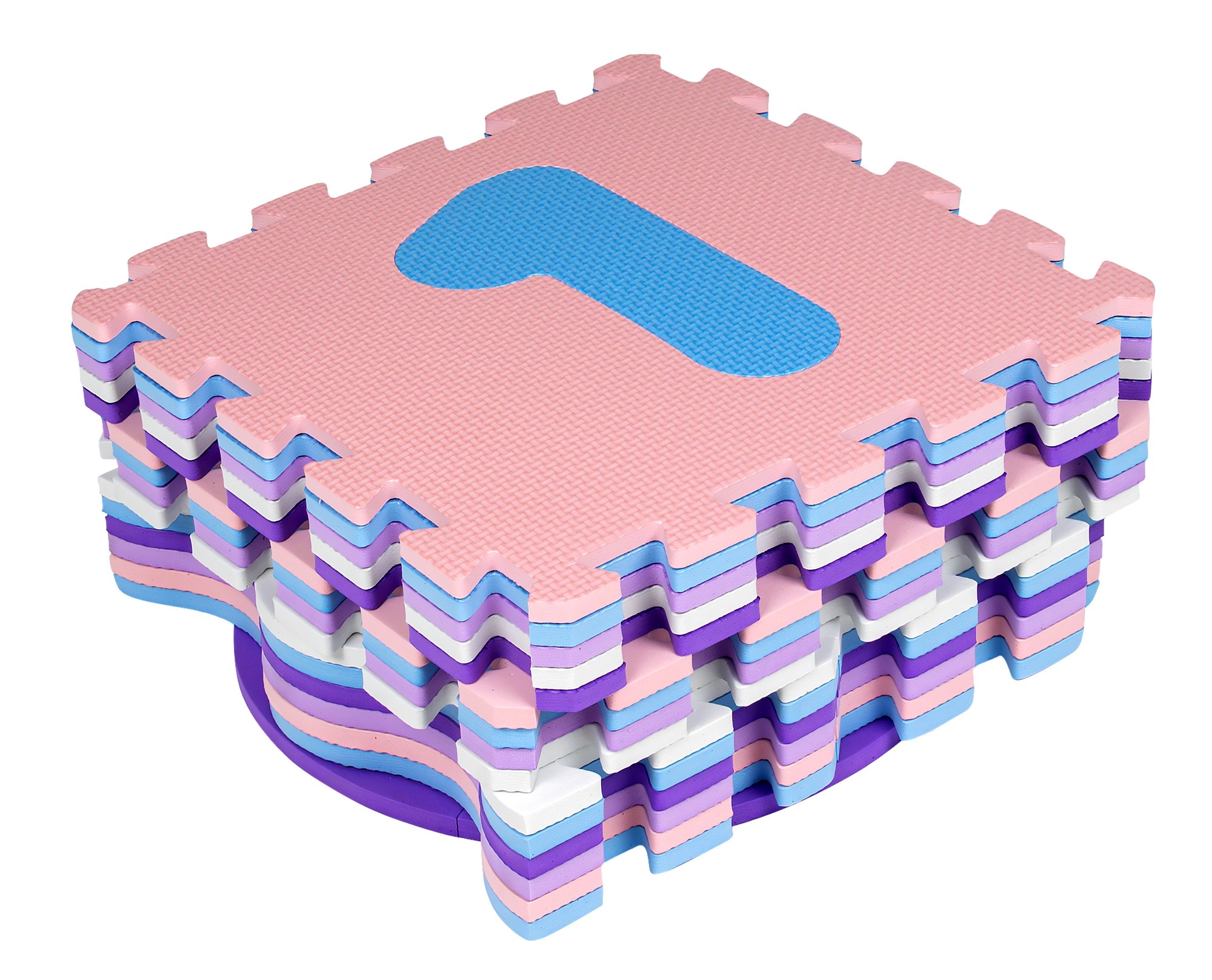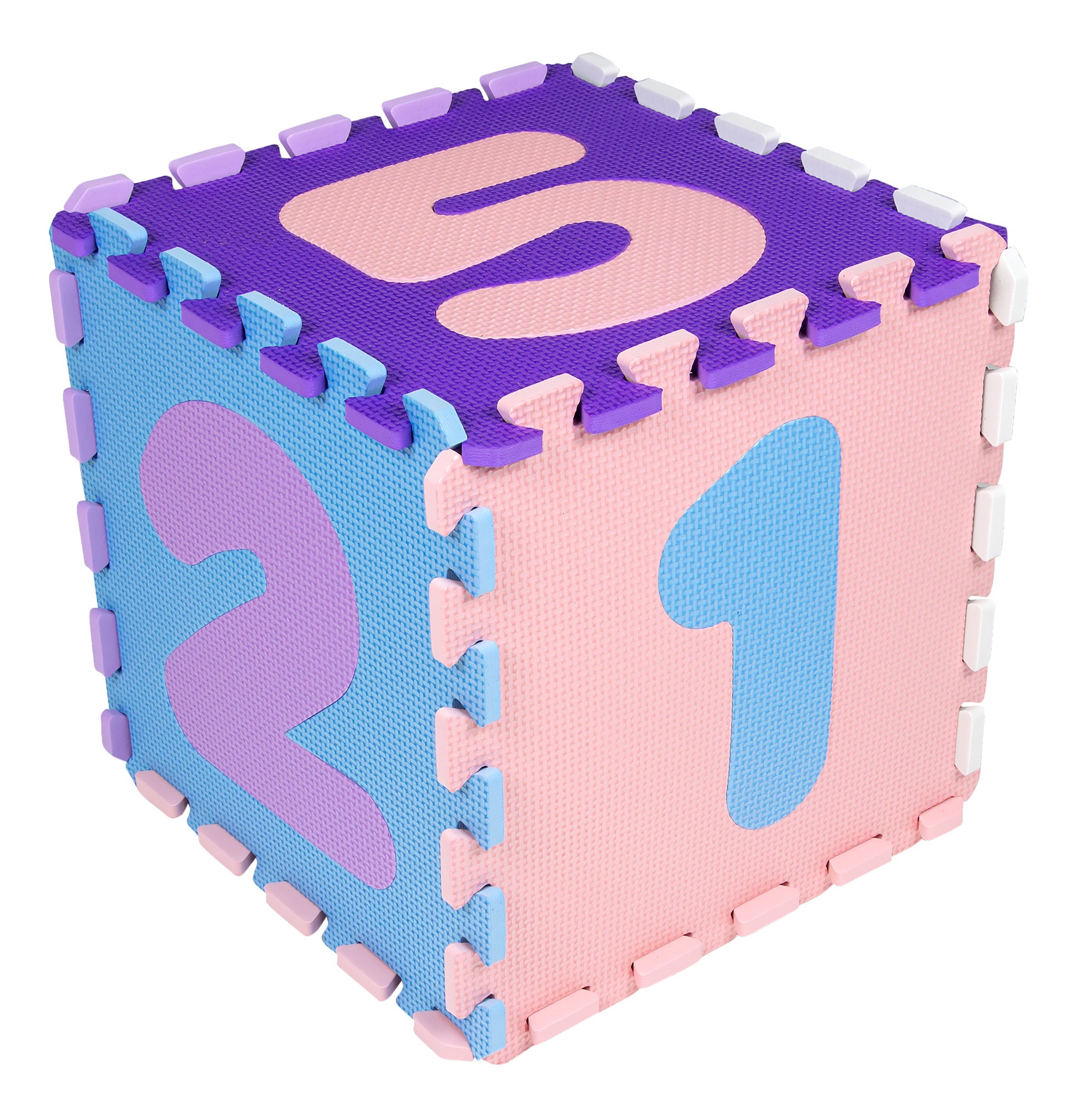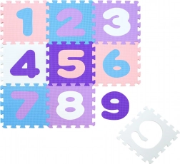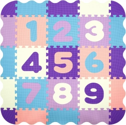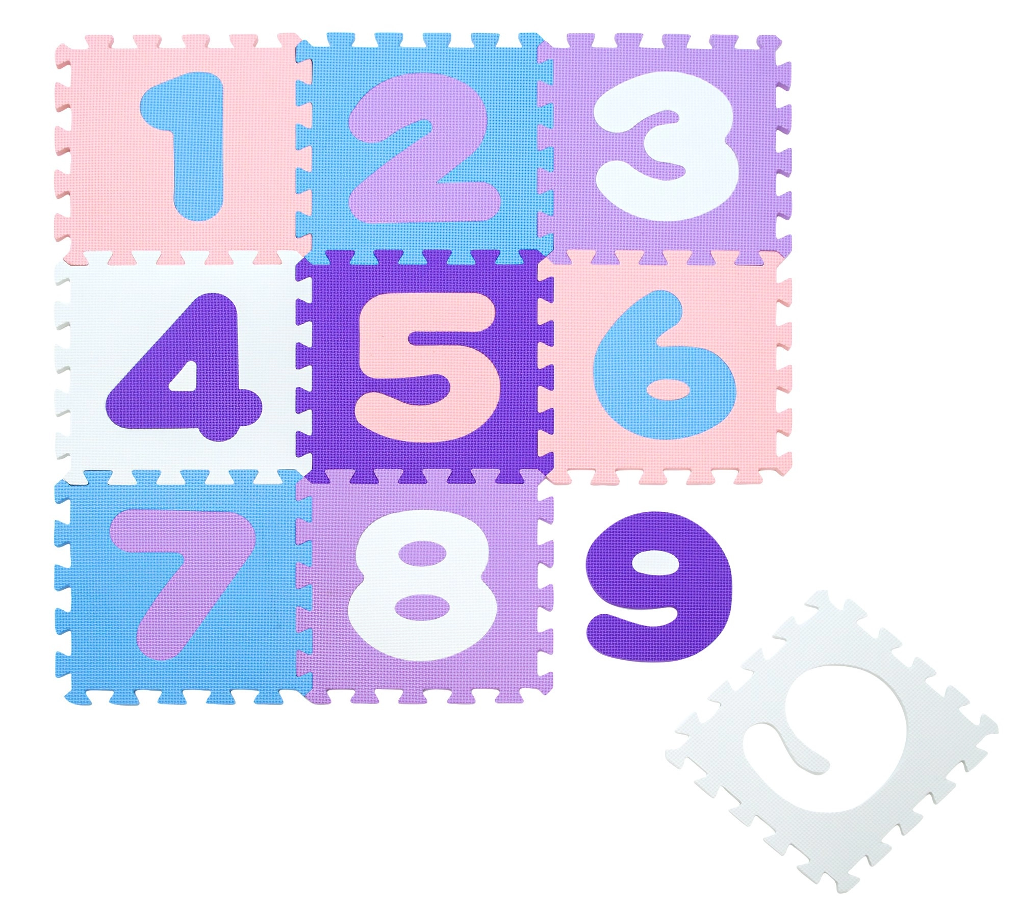 Svaki dio ima izvadivi element – znamenku 1–9. Djeca tako vježbaju prepoznavanje brojeva, koordinaciju i prostorno razmišljanje. Dijelove je moguće spajati ravno ili u 3D oblike (npr. kocka). Materijal EVA je bez ftalata, formamida, BPA i PVC-a, izvrsno izolira hladnoću od poda i prigušuje udarce.