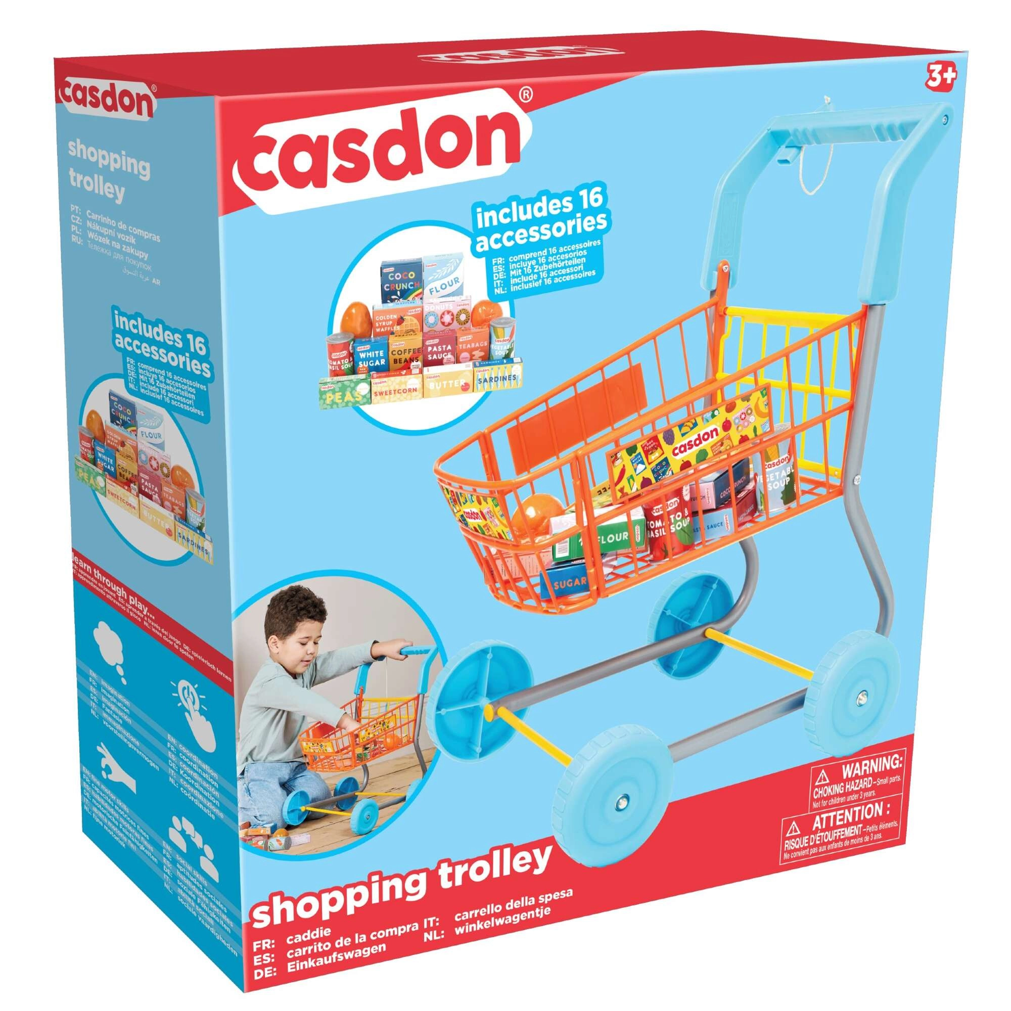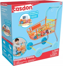 Šarena dječja kupovna košarica iz serije CASDON Little Shopper donosi realistično igranje trgovine. Ima stabilna četiri kotača, laganu plastičnu konstrukciju i praktičnu ručku za lako guranje. U kompletu je 16 imitacija namirnica za zabavne uloge te razvoj mašte i motorike.