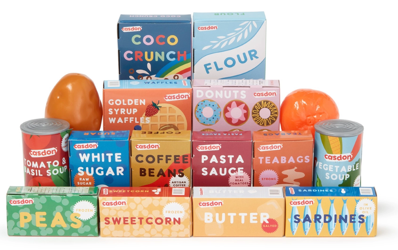 U kompletu je 16 komada imitacija namirnica: kutijice i limenke s tiskom (brašno, čaj, kava, grašak, šećer i dr.) te plastično voće/povrće.