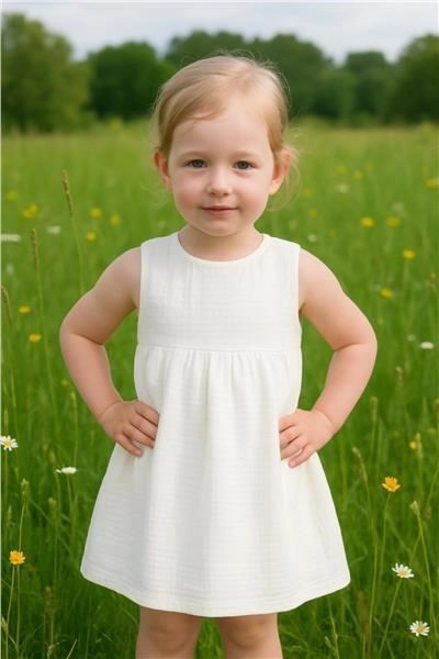 Preslatka dječja haljinica New Baby Elizabeth sašivena je od nježnog mušlina koji se ističe prozračnošću, mekoćom i lakoćom. A-kroj bez rukava upotpunjuje lijepo nabrana suknjica i kopčanje na druker na leđima za brzo odijevanje.