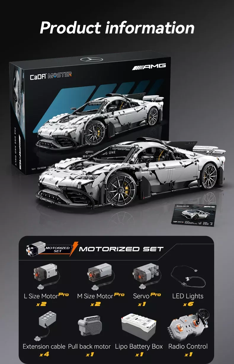 Sastavite ikonski hypercar MERCEDES‑AMG ONE u mjerilu 1:8 iz premium seta CaDA Master. Model s 3295 dijelova nudi RC upravljanje 2,4 GHz, otvarajuća krilna vrata, neovisni ovjes na svim kotačima, realističan V6 motor i LED svjetla. Vrhunska izrada, detaljna karoserija i odobrene MICHELIN gume čine ovaj set kolekcionarskim draguljem i savršenim poklonom.