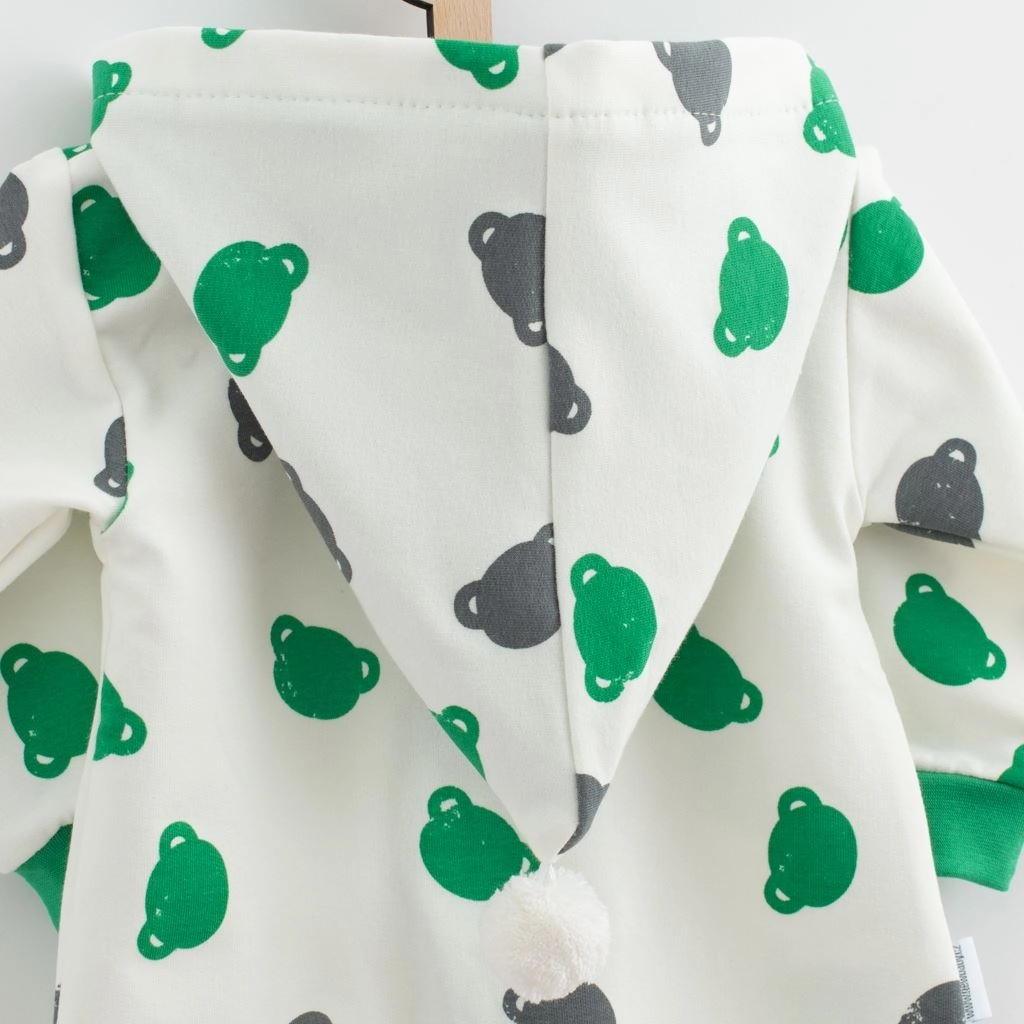 Kombinezon je prikladan za svakodnevnu upotrebu kod kuće i na otvorenom. Zahvaljujući mješavini pamuka i elastana mekan je, prozračan i blago rastezljiv, pa se prilagođava potrebama bebe u razdoblju od 4–6 mjeseci.