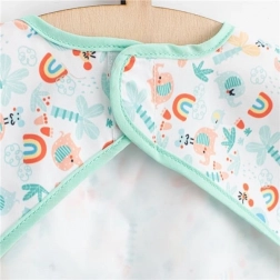 Kopčanje na čičak olakšava brzo oblačenje i skidanje, dok mekani prednji džep hvata mrvice i kapljice. Pregača je pogodna za hranjenje, samostalno jedenje i kreativne aktivnosti. Moderni uzorci i zelena boja razveselit će djecu i roditelje.