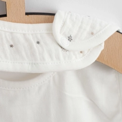 Praktičan i nježan muslinov podbradak New Baby Arthur štiti odjeću, a ujedno je ugodan na dodir. Zahvaljujući drukerima lako ga podesite na 2 veličine. Prozračni muslin od 100% pamuka smanjuje rizik od pregrijavanja i idealan je za osjetljivu dječju kožu.