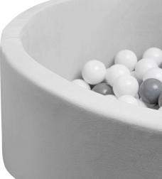 Razveselite djecu i podržite njihov razvoj s ovim mekanim suhim bazenom sa 150 kuglicama brenda NEW BABY. Sigurna poliuretanska pjena, odvojiva navlaka sa skrivenim patentnim zatvaračem i certificirane kuglice u bijeloj i sivoj boji osiguravaju zabavu i sigurnost u dječjoj sobi ili dnevnom boravku.