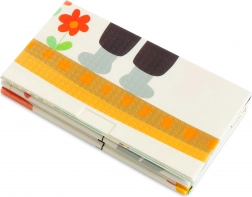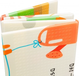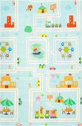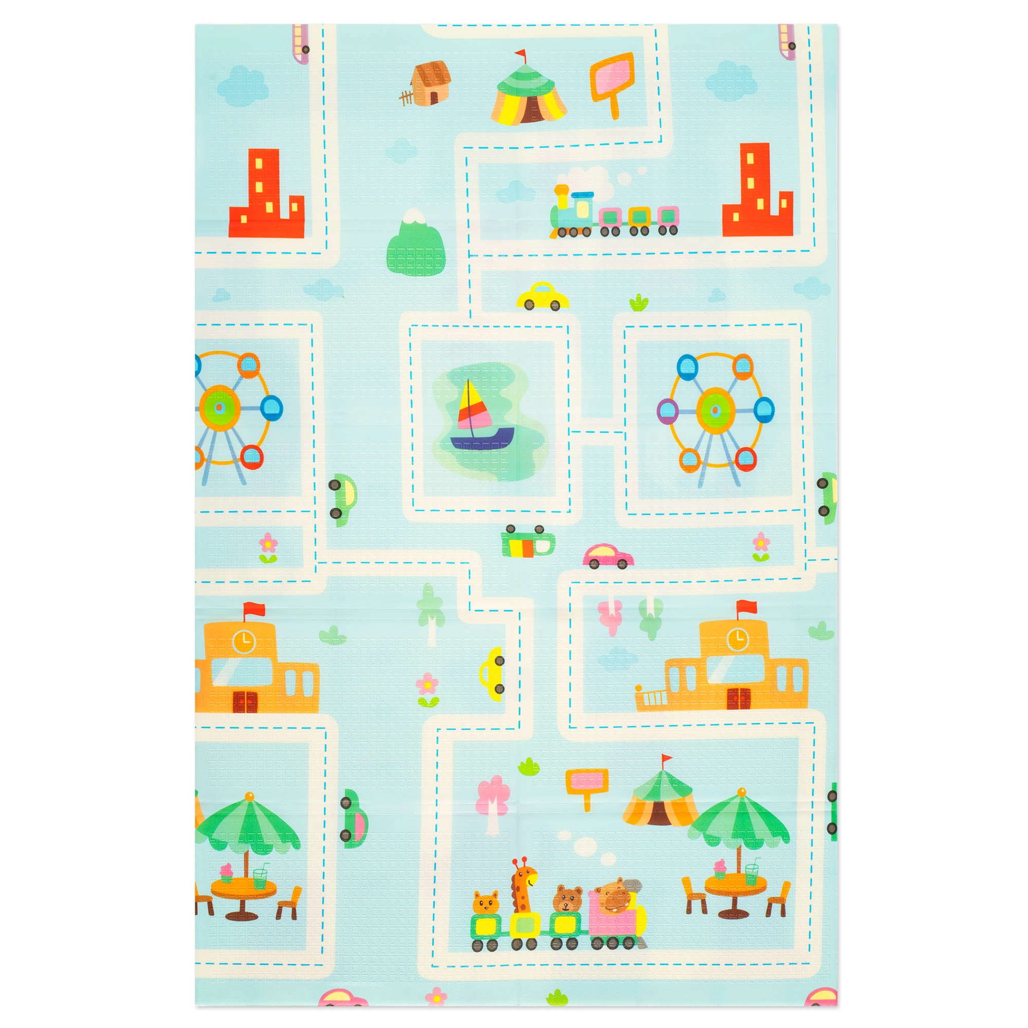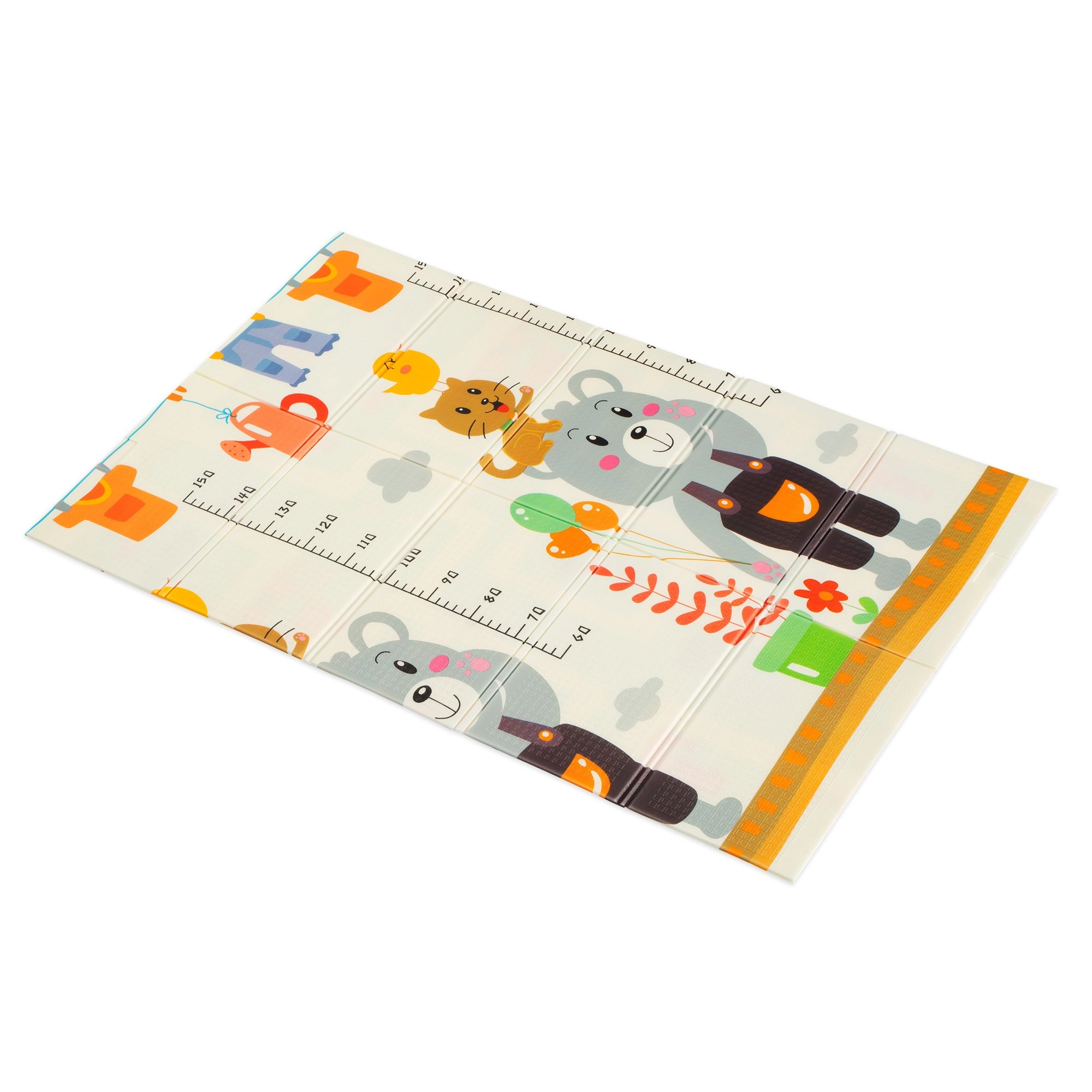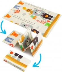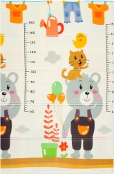 Jedna strana nudi vesele životinjske motive s mjerkom visine, druga strana šarene ceste i zgrade za razvoj mašte i osjetilne percepcije.