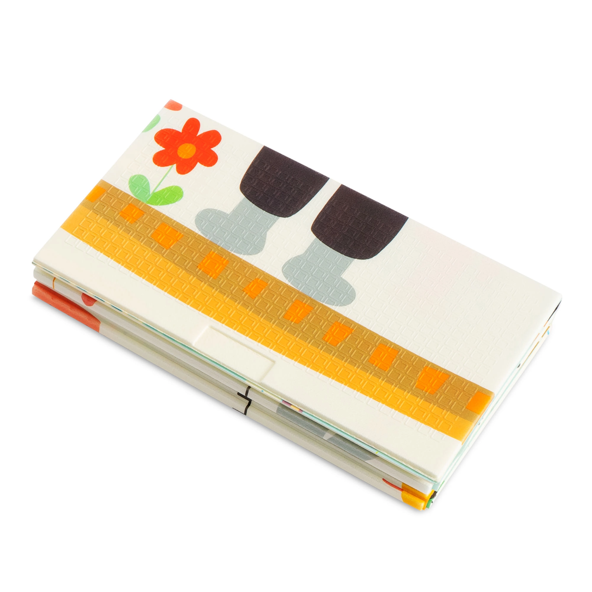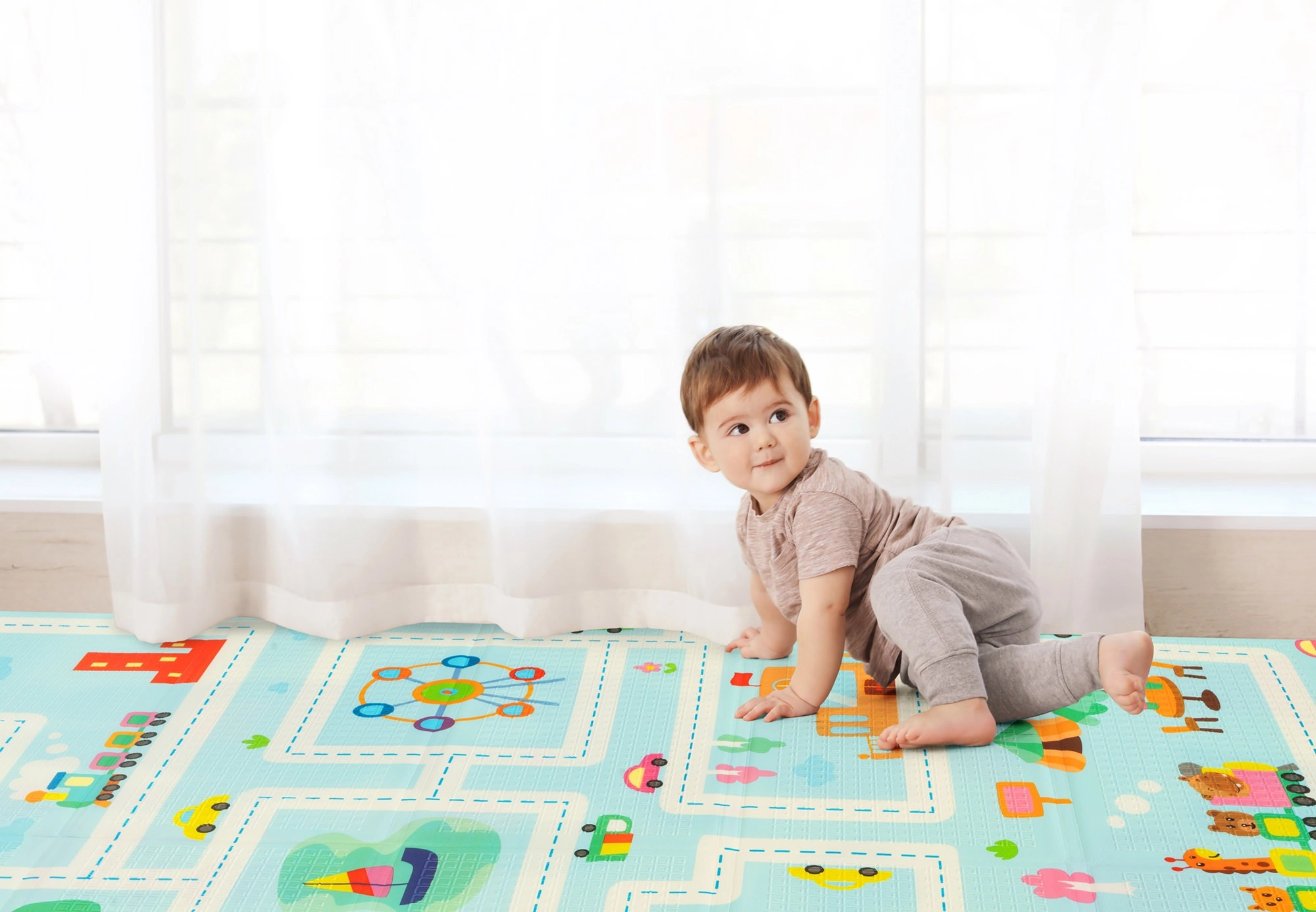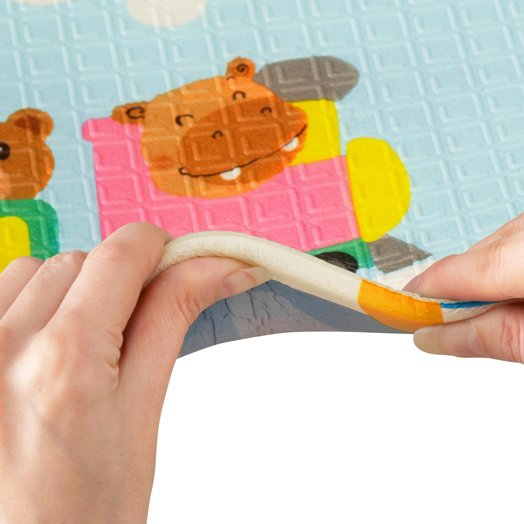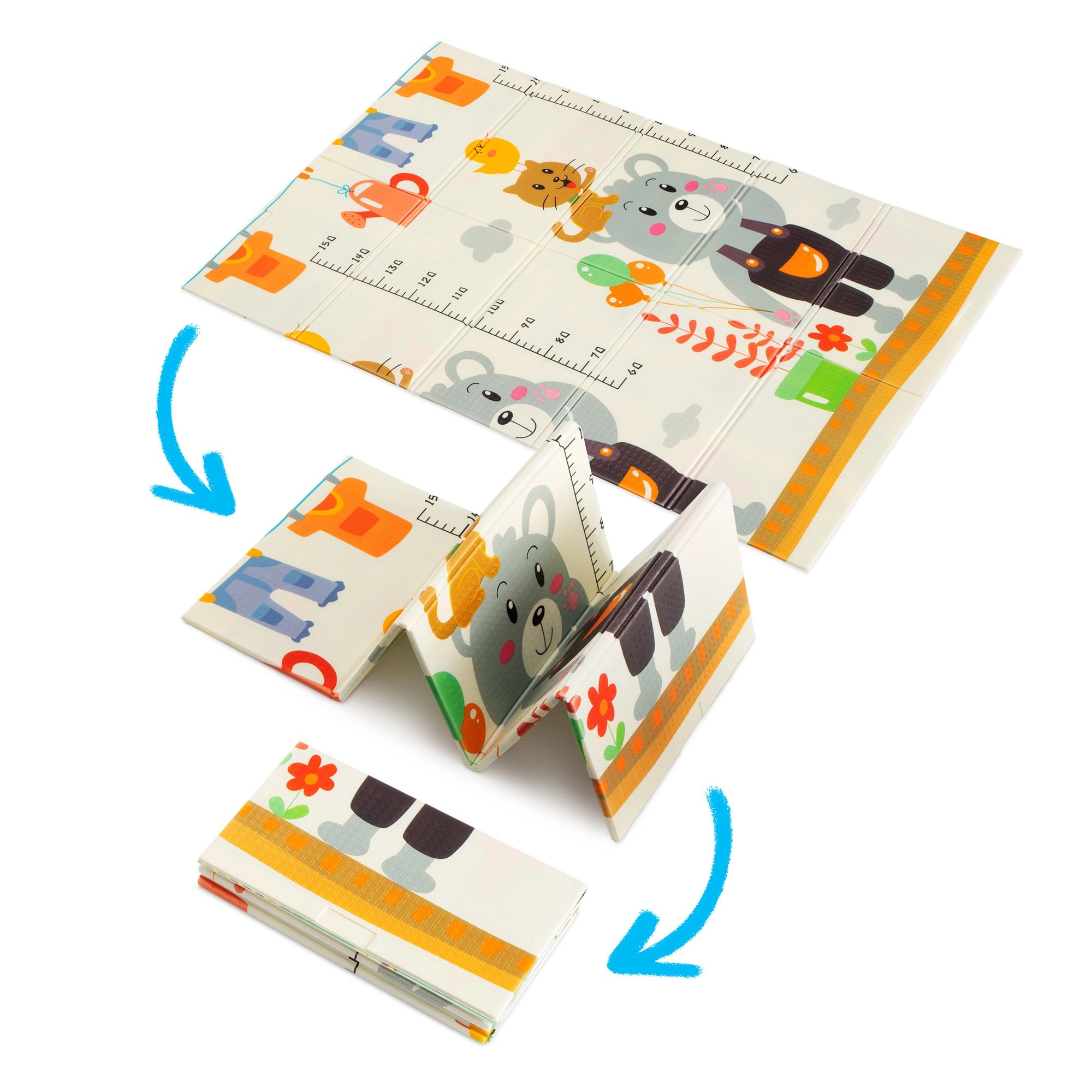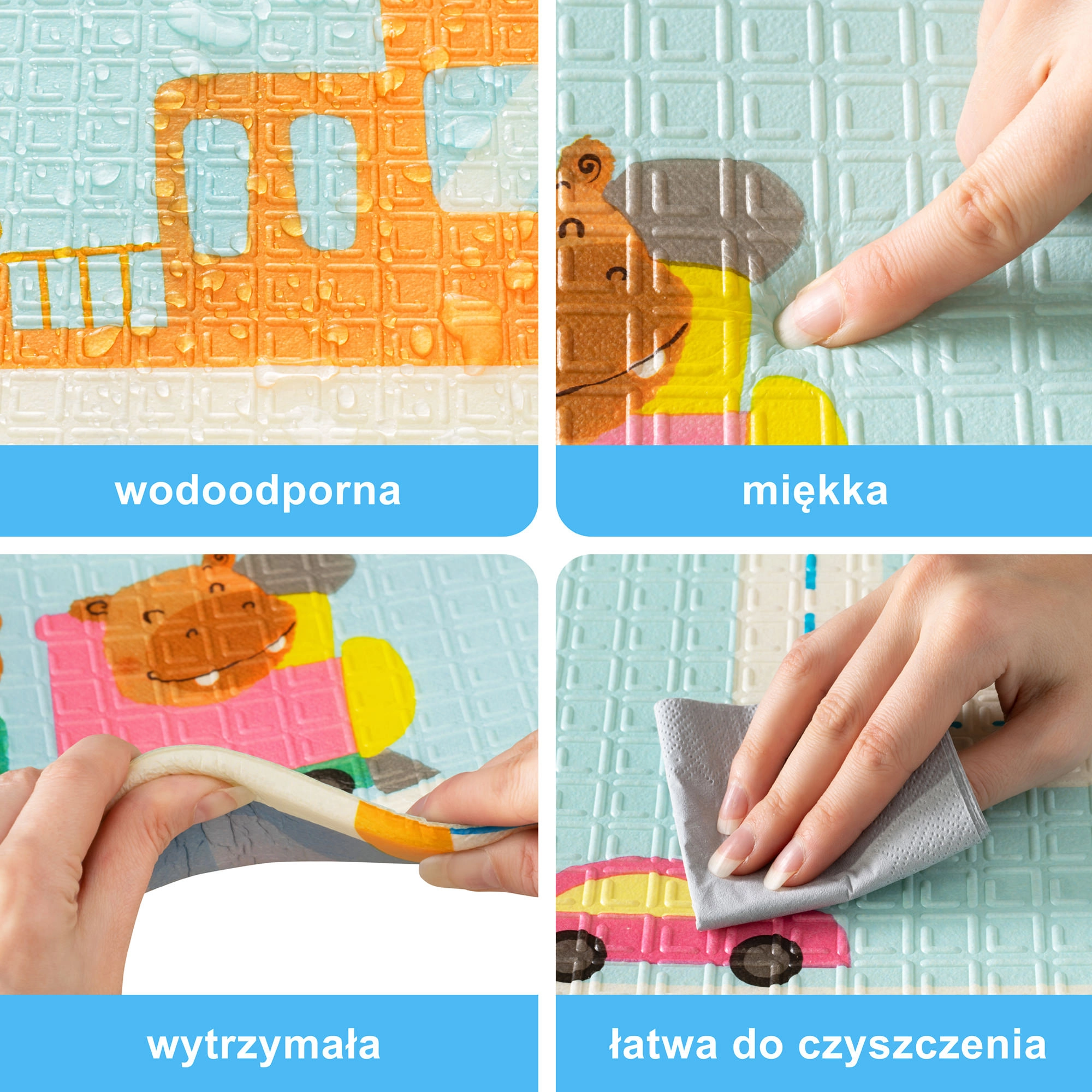 Obostrani dizajn donosi dva edukativna motiva: vesele životinjice s mjerkom visine za praćenje rasta i šarene ceste sa zgradama i vozilima za razvoj mašte. Podlogu jednostavno sklopite u nekoliko sekundi, lako je pohranite i zahvaljujući priloženoj torbi s patentnim zatvaračem ponesete bilo kamo – u dnevni boravak, dječju sobu, na balkon, u vrt ili na put.